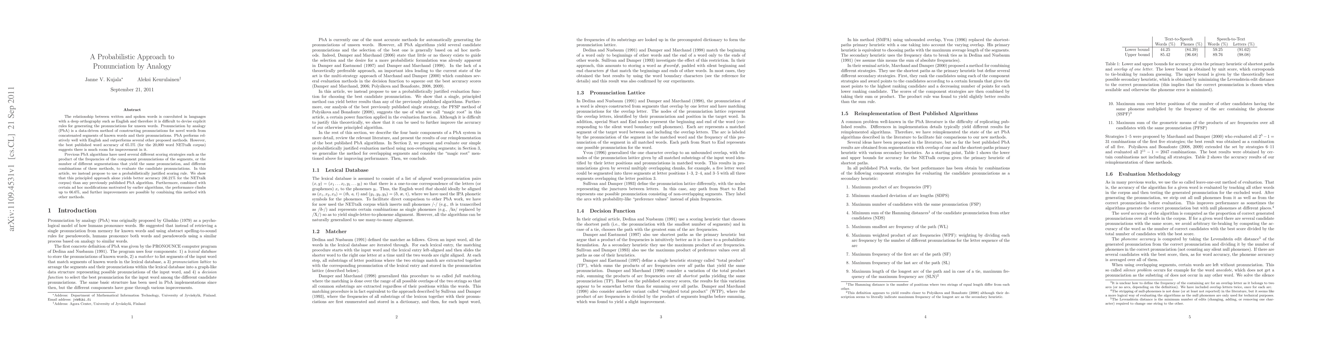 The relationship between written and spoken words is convoluted in languages with a deep orthography such as English and therefore it is difficult to devise explicit rules for generating the pronunciations for unseen words. Pronunciation by analogy (PbA) is a data-driven method of constructing pronunciations for novel words from concatenated segments of known words and their pronunciations. PbA performs relatively well with English and outperforms several other proposed methods. However, the best published word accuracy of 65.5% (for the 20,000 word NETtalk corpus) suggests there is much room for improvement in it. Previous PbA algorithms have used several different scoring strategies such as the product of the frequencies of the component pronunciations of the segments, or the number of different segmentations that yield the same pronunciation, and different combinations of these methods, to evaluate the candidate pronunciations. In this article, we instead propose to use a probabilistically justified scoring rule. We show that this principled approach alone yields better accuracy (66.21% for the NETtalk corpus) than any previously published PbA algorithm. Furthermore, combined with certain ad hoc modifications motivated by earlier algorithms, the performance climbs up to 66.6%, and further improvements are possible by combining this method with other methods.