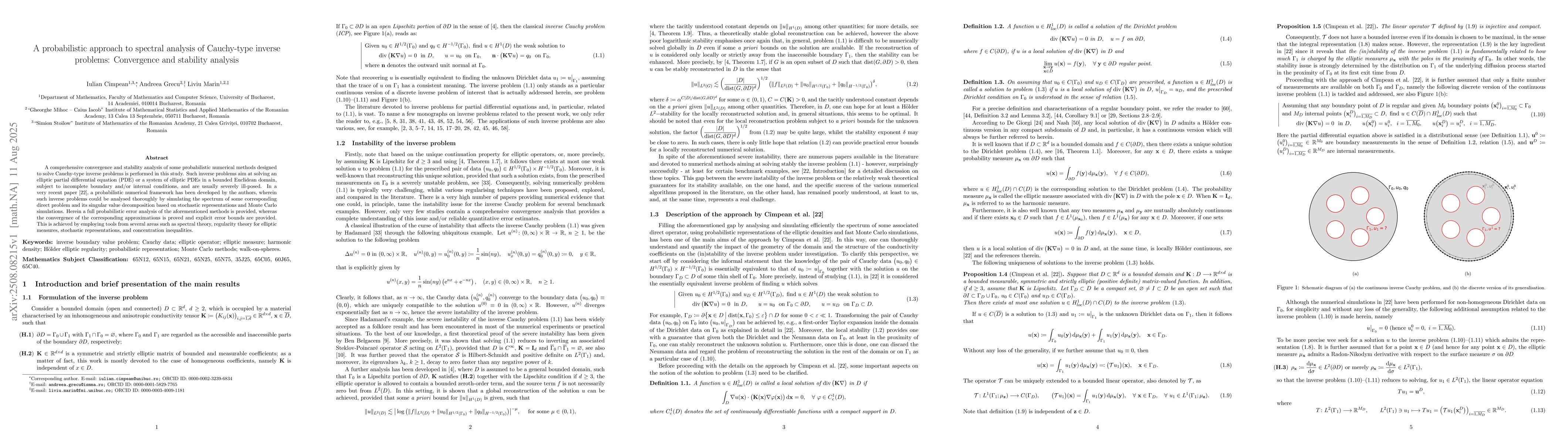 This research employs a comprehensive convergence and stability analysis of probabilistic numerical methods designed for Cauchy-type inverse problems, utilizing tools from spectral theory, regularity theory for elliptic measures, stochastic representations, and concentration inequalities.