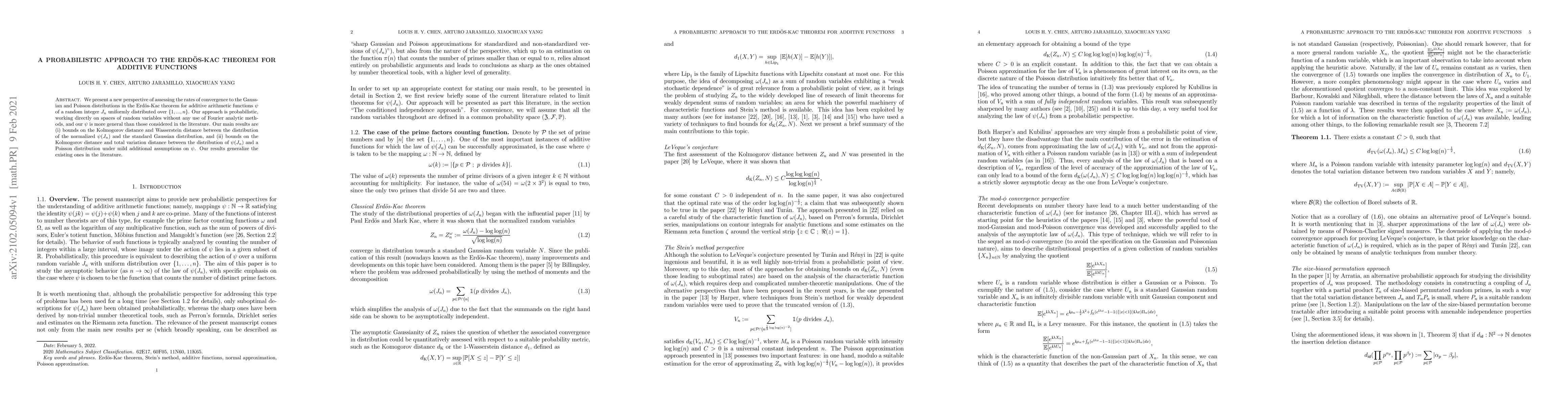 We present a new perspective of assessing the rates of convergence to the Gaussian and Poisson distributions in the Erd\"os-Kac theorem for additive arithmetic functions $\psi$ of a random integer $J_n$ uniformly distributed over $\{1,...,n\}$. Our approach is probabilistic, working directly on spaces of random variables without any use of Fourier analytic methods, and our $\psi$ is more general than those considered in the literature. Our main results are (i) bounds on the Kolmogorov distance and Wasserstein distance between the distribution of the normalized $\psi(J_n)$ and the standard Gaussian distribution, and (ii) bounds on the Kolmogorov distance and total variation distance between the distribution of $\psi(J_n)$ and a Poisson distribution under mild additional assumptions on $\psi$. Our results generalize the existing ones in the literature.