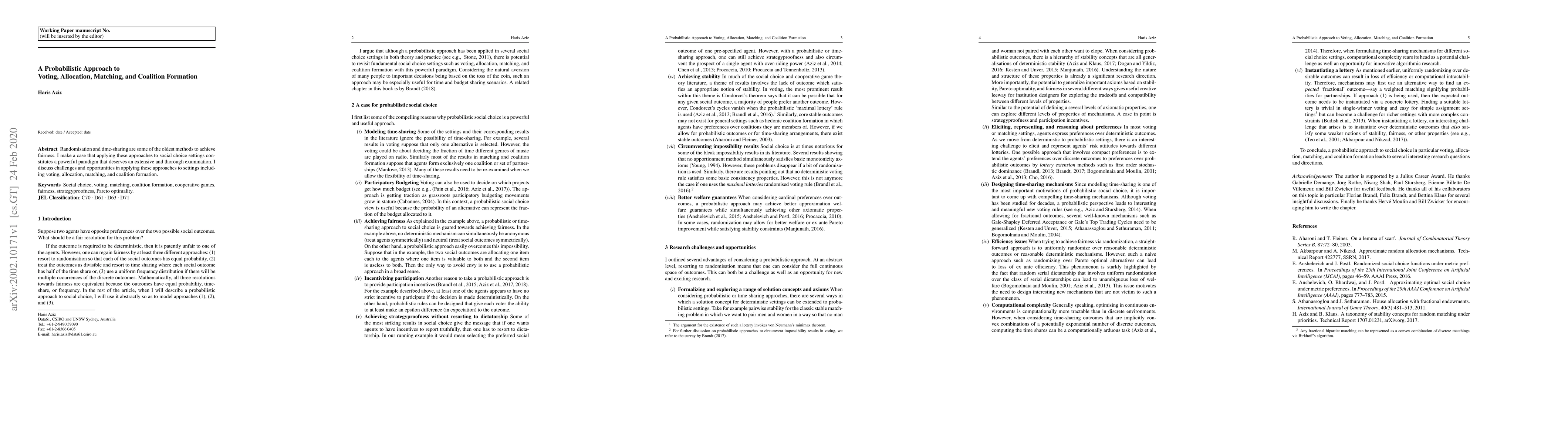 This paper advocates for a probabilistic approach using randomization and time-sharing to achieve fairness in social choice contexts, including voting, allocation, matching, and coalition formation, highlighting both challenges and opportunities in these applications.