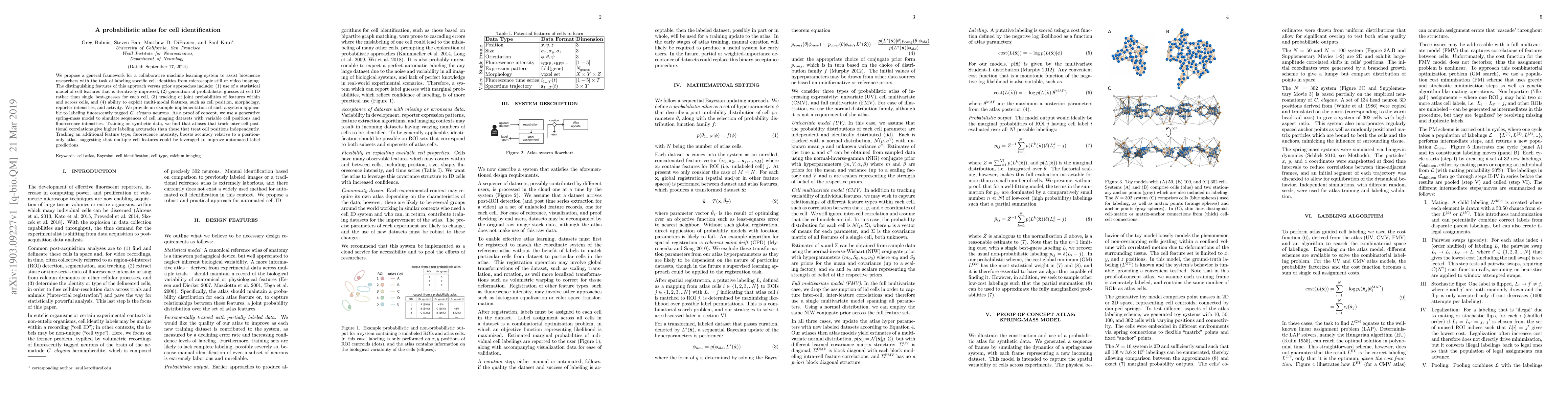 We propose a general framework for a collaborative machine learning system to assist bioscience researchers with the task of labeling specific cell identities from microscopic still or video imaging. The distinguishing features of this approach versus prior approaches include: (1) use of a statistical model of cell features that is iteratively improved, (2) generation of probabilistic guesses at cell ID rather than single best-guesses for each cell, (3) tracking of joint probabilities of features within and across cells, and (4) ability to exploit multi-modal features, such as cell position, morphology, reporter intensities, and activity. We provide an example implementation of such a system applicable to labeling fluorescently tagged \textit{C. elegans} neurons. As a proof of concept, we use a generative spring-mass model to simulate sequences of cell imaging datasets with variable cell positions and fluorescence intensities. Training on synthetic data, we find that atlases that track inter-cell positional correlations give higher labeling accuracies than those that treat cell positions independently. Tracking an additional feature type, fluorescence intensity, boosts accuracy relative to a position-only atlas, suggesting that multiple cell features could be leveraged to improve automated label predictions.