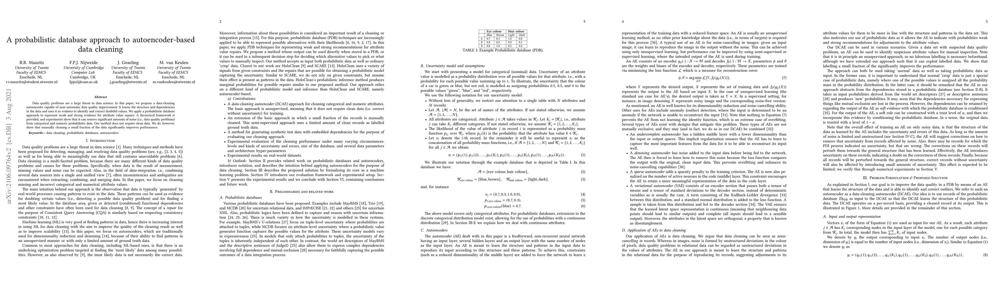 A new data cleaning approach using autoencoders and probabilistic databases removes significant amounts of noise from datasets without requiring clean data. Experiments show improved performance with manual cleaning of a small fraction of the data.