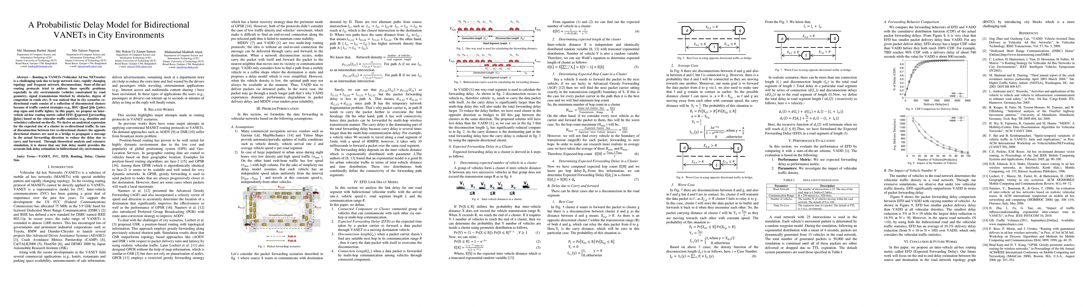 This paper proposes a probabilistic delay model called EFD for routing in bidirectional VANETs in city environments, utilizing real-time traffic statistics to estimate forwarding delays. The model leverages opposite directional clusters to bridge disconnections, demonstrating accurate link delay estimations through theoretical analysis and simulations.