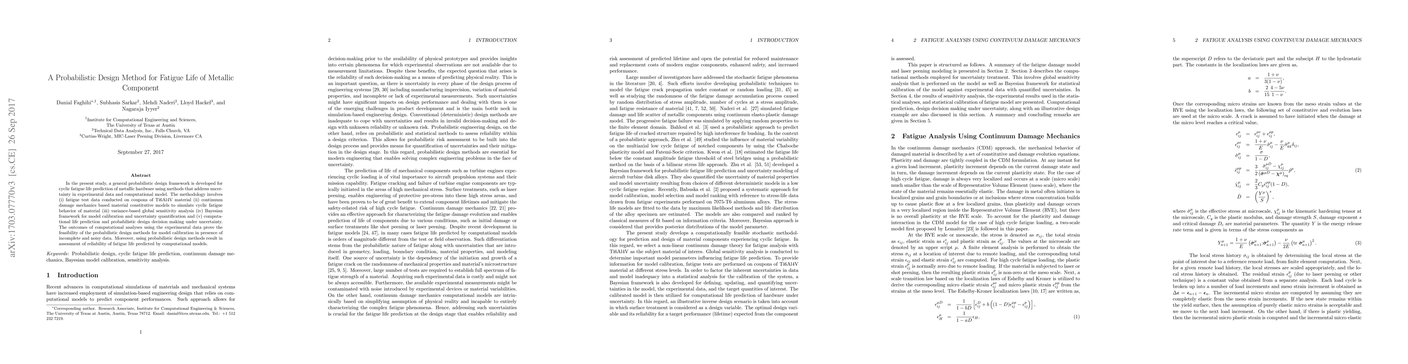 This study develops a probabilistic design framework for predicting the fatigue life of metallic components, utilizing experimental data, continuum damage mechanics, sensitivity analysis, Bayesian calibration, and computational life prediction to address uncertainties and improve reliability assessments. The method is validated using Ti6Al4V material data, demonstrating its effectiveness in model calibration and reliability evaluation under uncertainty.