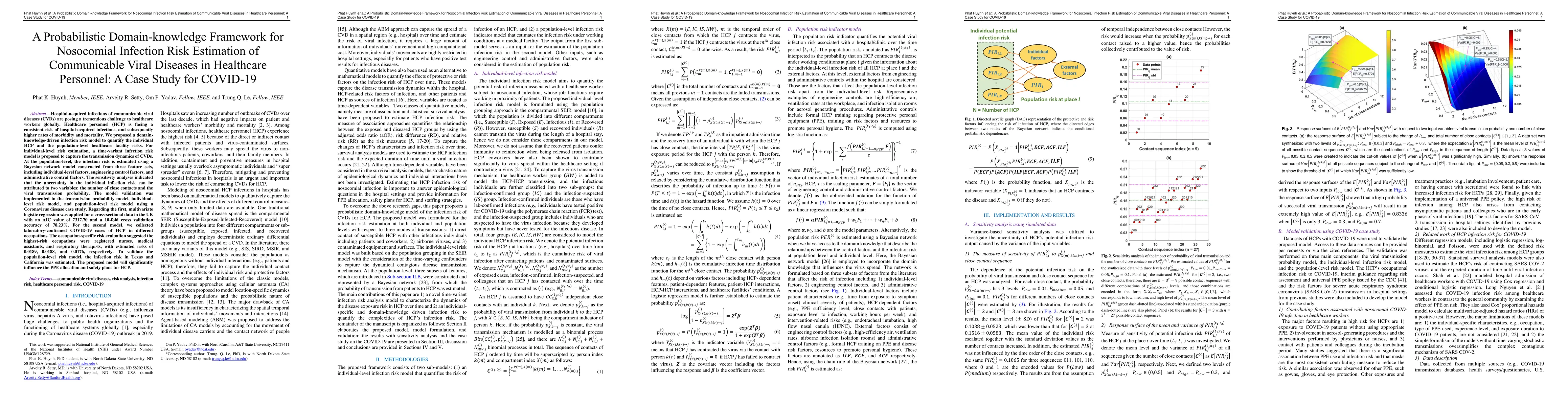 This paper proposes a probabilistic framework to estimate nosocomial infection risks for healthcare personnel, focusing on communicable viral diseases like COVID-19. It combines individual-level time-variant models and population-level Bayesian networks to quantify risks, highlighting the importance of contact numbers and transmission probability. The model was validated using UK cross-sectional data and specific COVID-19 cases, showing high-risk occupations and aiding in PPE allocation and safety planning.