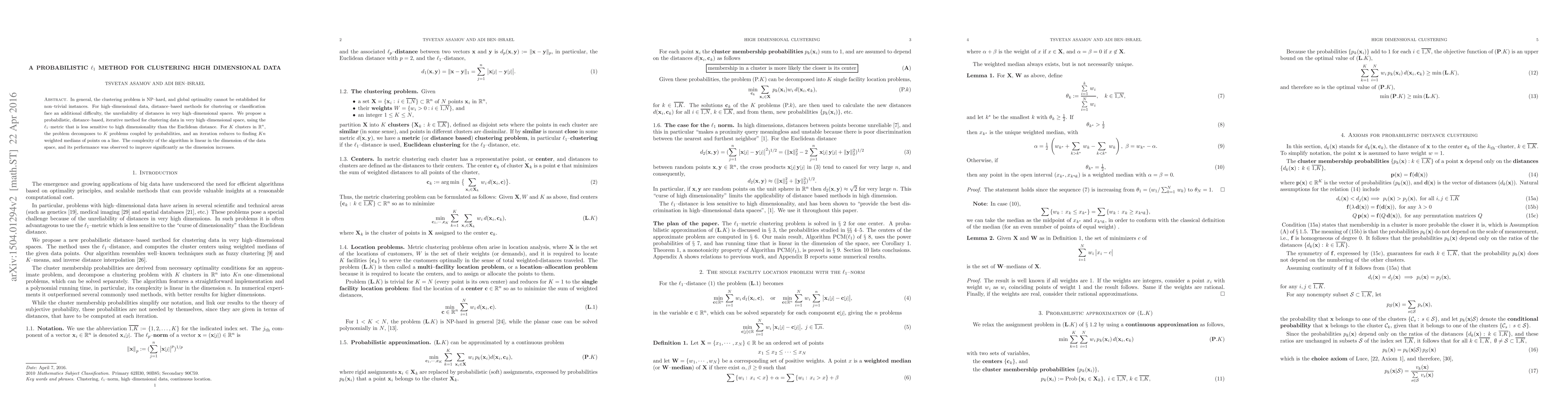 This paper proposes a probabilistic $\ell_1$ method for clustering high-dimensional data, addressing the unreliability of distances in high-dimensional spaces. The algorithm iteratively finds weighted medians, demonstrating linear complexity and improved performance with increasing dimensionality.