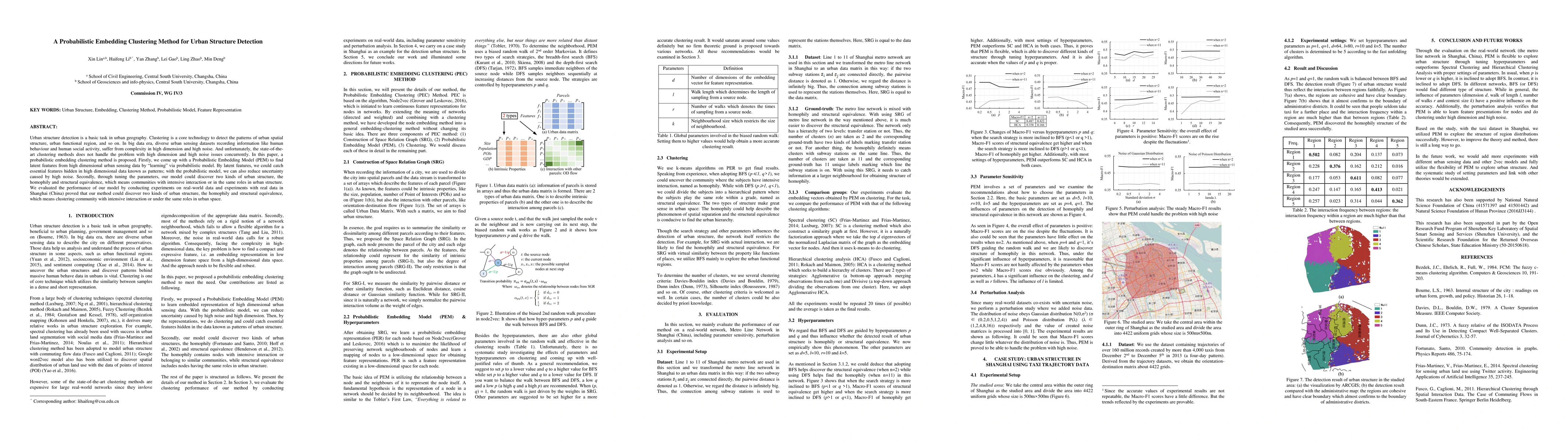 This paper proposes a probabilistic embedding clustering method for detecting urban structures in high-dimensional, noisy urban sensing data. The Probabilistic Embedding Model (PEM) identifies latent features to reveal urban patterns while reducing uncertainty from noise, successfully discovering homophily and structural equivalence in urban communities.
