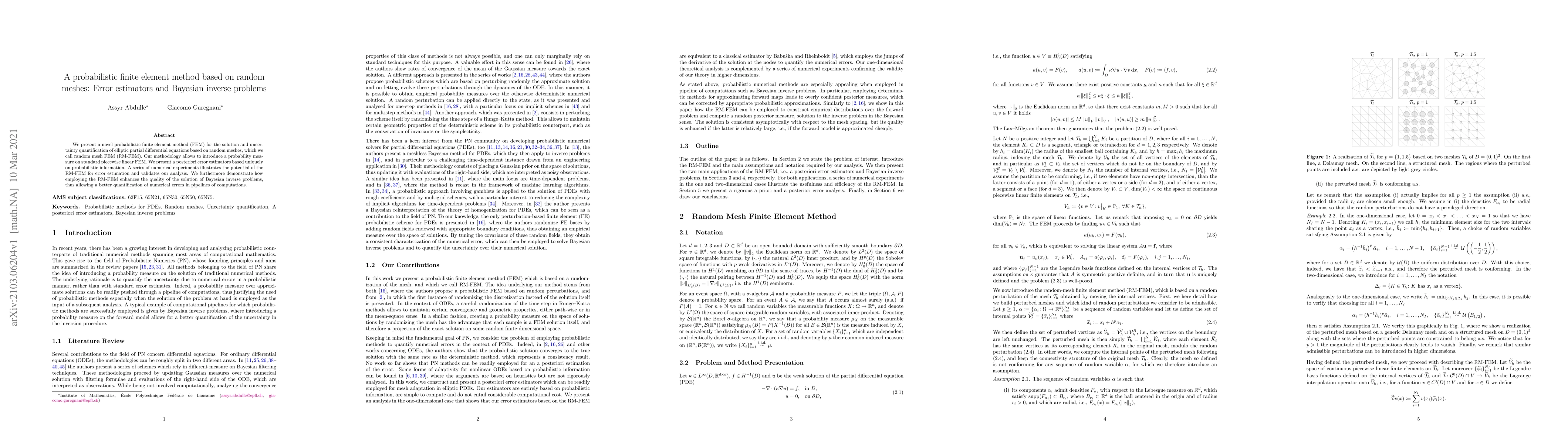 The paper presents a probabilistic finite element method based on random meshes, RM-FEM, with novel a posteriori error estimators and demonstrates its effectiveness in Bayesian inverse problems.