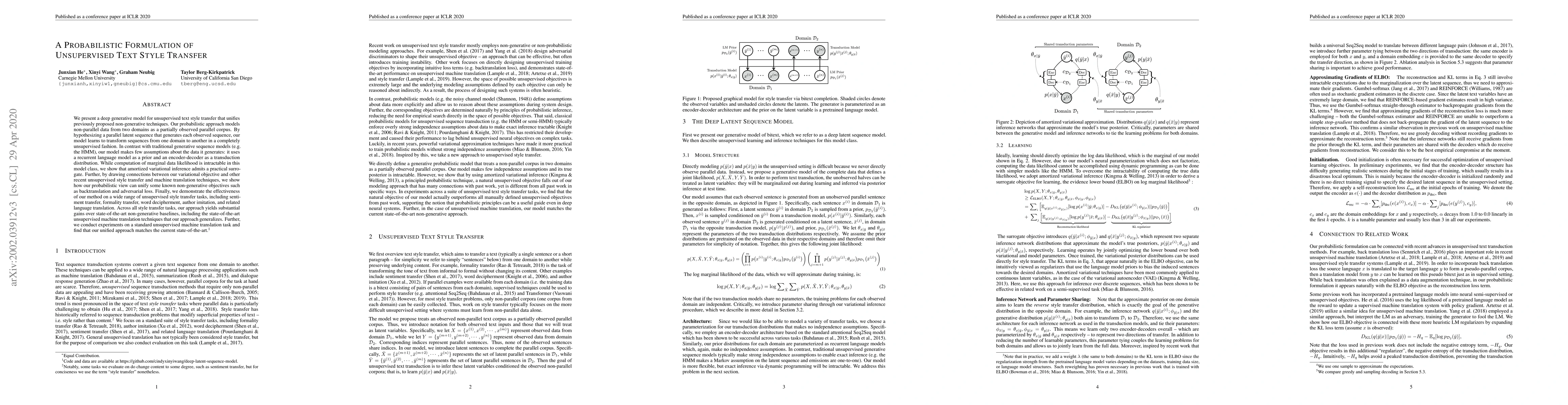 This paper introduces a deep generative model for unsupervised text style transfer, employing a probabilistic approach that treats non-parallel data as a partially observed parallel corpus. The model uses amortized variational inference to achieve practical results and demonstrates significant improvements over non-generative baselines across various style transfer tasks.
