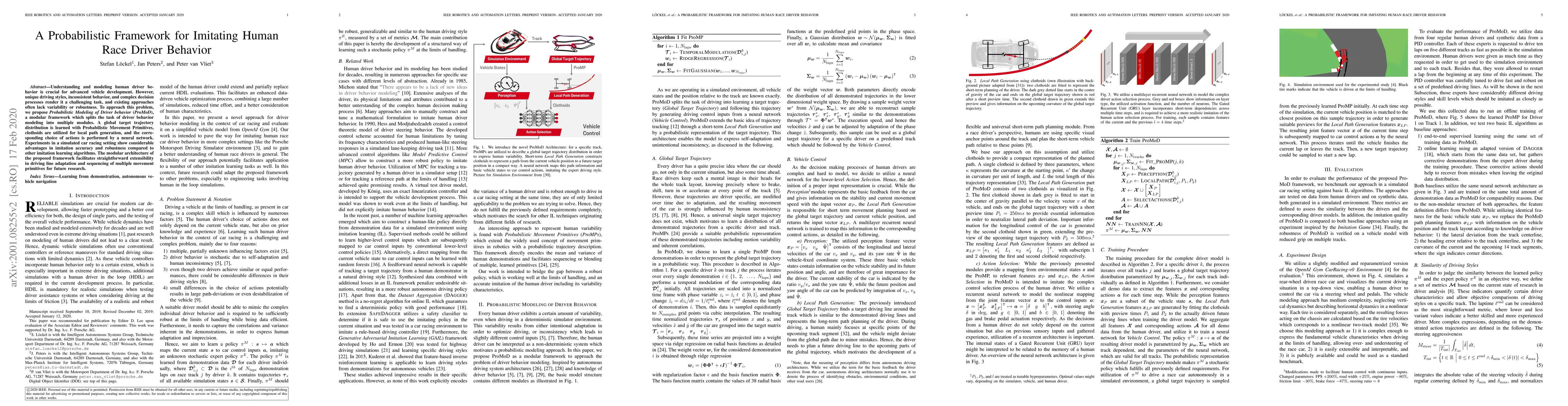 The paper proposes ProMoD, a probabilistic framework for imitating human race driver behavior, utilizing modular components for trajectory learning, path generation, and action selection. Experiments demonstrate improved imitation accuracy and robustness compared to existing methods, highlighting the framework's potential for future enhancements.