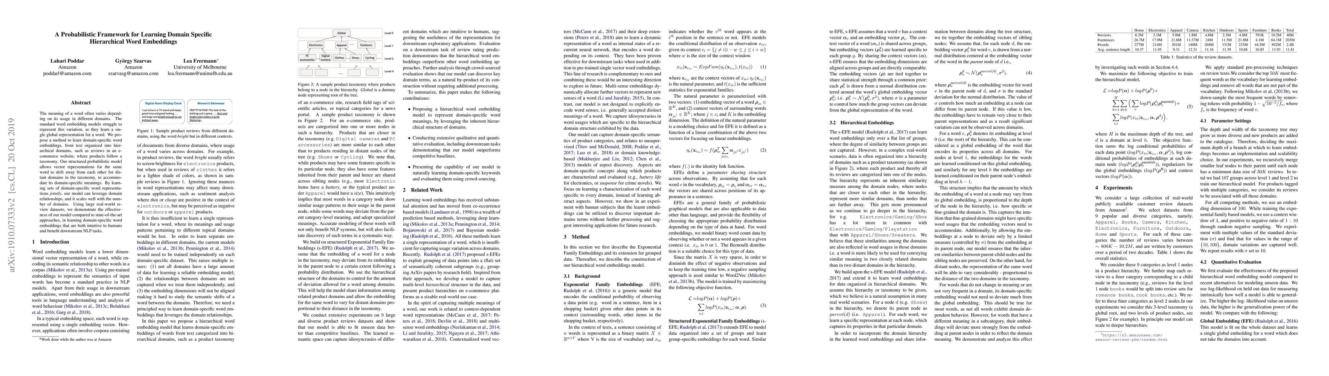 This paper proposes a probabilistic framework to learn domain-specific hierarchical word embeddings, addressing the limitation of global word representations in standard models. The model leverages hierarchical domain relationships to adapt word meanings, demonstrating improved performance on real-world review datasets for downstream NLP tasks.
