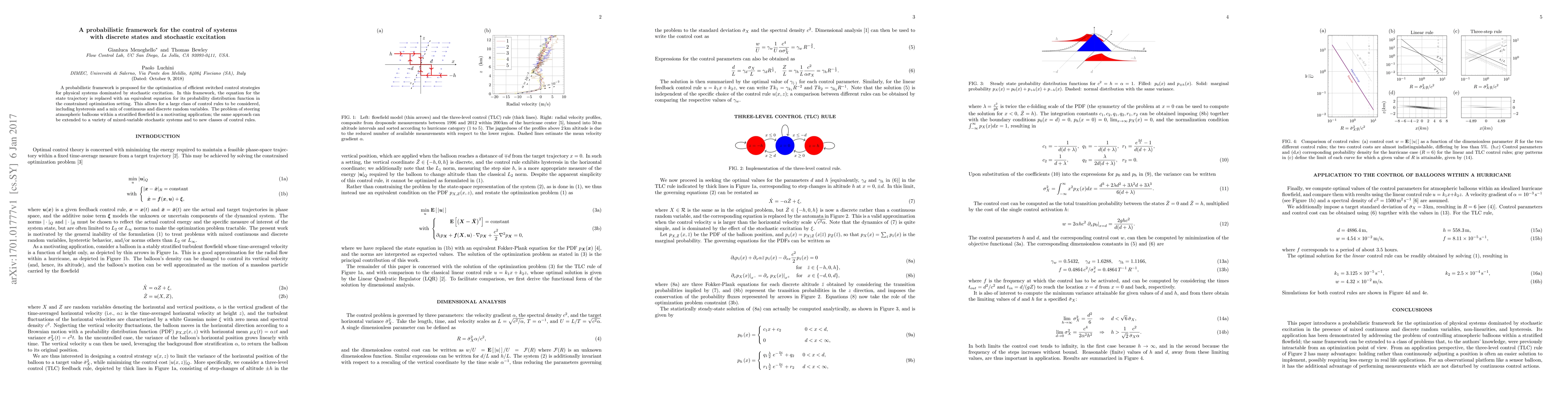 A probabilistic framework optimizes switched control strategies for systems with stochastic excitation, considering a range of control rules including hysteresis and mixed continuous/discrete variables. This approach can be applied to various mixed-variable stochastic systems, such as steering atmospheric balloons in stratified flowfields.