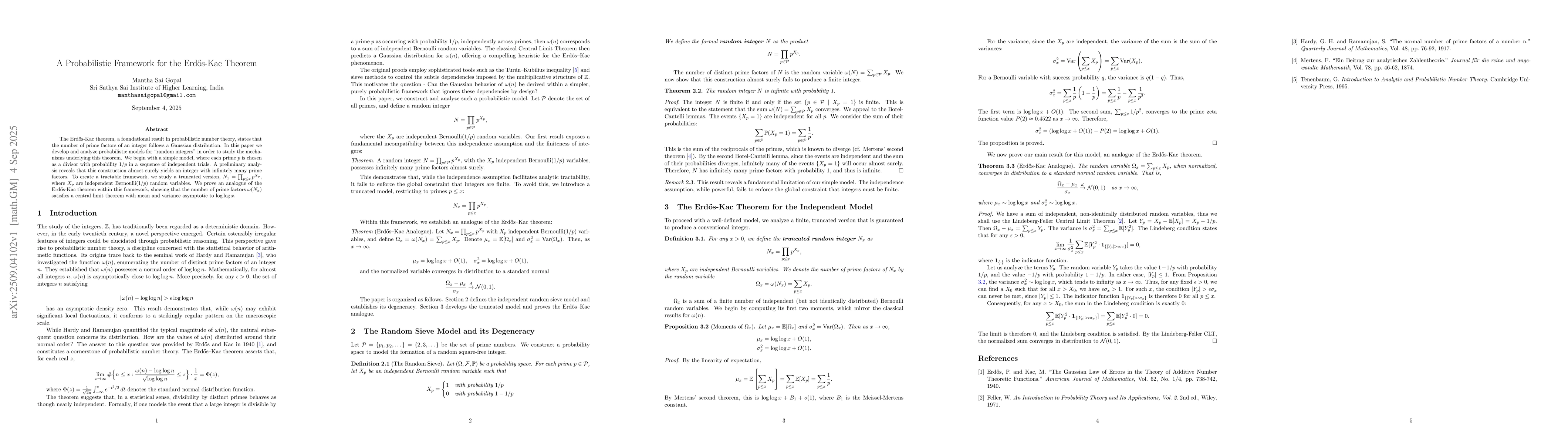The Erdos-Kac theorem, a foundational result in probabilistic number theory, states that the number of prime factors of an integer follows a Gaussian distribution. In this paper we develop and analyze probabilistic models for "random integers" to study the mechanisms underlying this theorem. We begin with a simple model, where each prime p is chosen as a divisor with probability 1/p in a sequence of independent trials. A preliminary analysis shows that this construction almost surely yields an integer with infinitely many prime factors. To create a tractable framework, we study a truncated version Nx = product of p<=x of p^Xp, where Xp are independent Bernoulli(1/p) random variables. We prove an analogue of the Erdos-Kac theorem within this framework, showing that the number of prime factors omega(Nx) satisfies a central limit theorem with mean and variance asymptotic to log log x.
