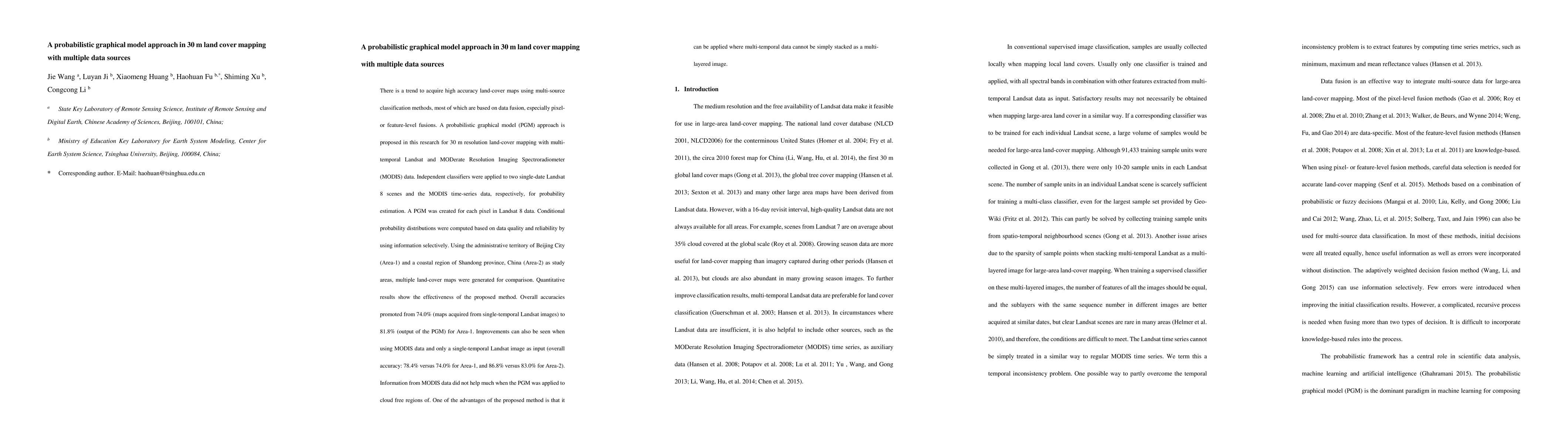 This paper proposes a probabilistic graphical model (PGM) approach for 30 m resolution land-cover mapping using multi-source data, achieving an overall accuracy improvement from 74.0% to 81.8% in Beijing City. The PGM method effectively integrates Landsat and MODIS data, showing significant accuracy gains when MODIS data is included.