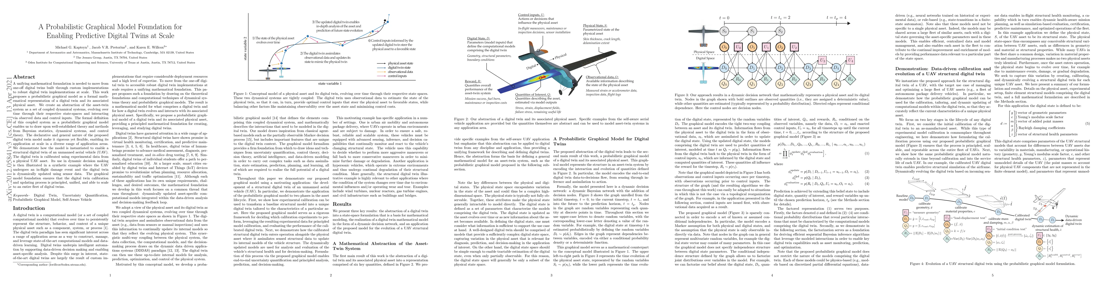 This paper proposes a probabilistic graphical model to create scalable predictive digital twins by formalizing the asset-twin system as coupled dynamical systems. The model leverages Bayesian statistics and control theory, demonstrated through a UAV digital twin calibrated with real data and used for dynamic decision-making during in-flight damage events.