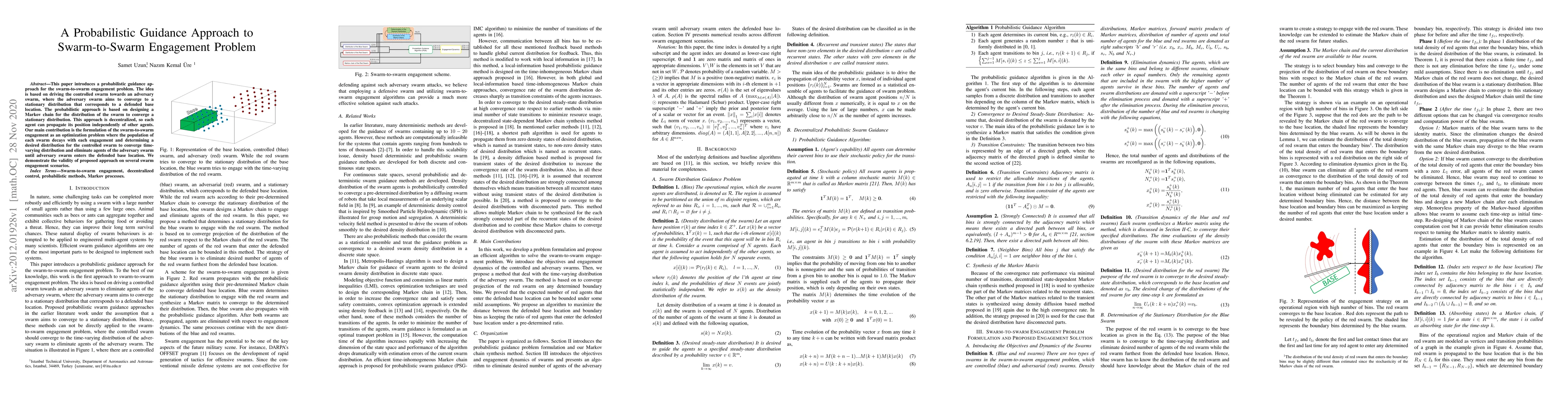 This paper proposes a probabilistic guidance method for swarm-to-swarm engagement, utilizing a decentralized Markov chain to guide the controlled swarm towards an adversary swarm. The approach formulates engagement as an optimization problem to minimize adversary swarm agents while driving the adversary towards a defended base.