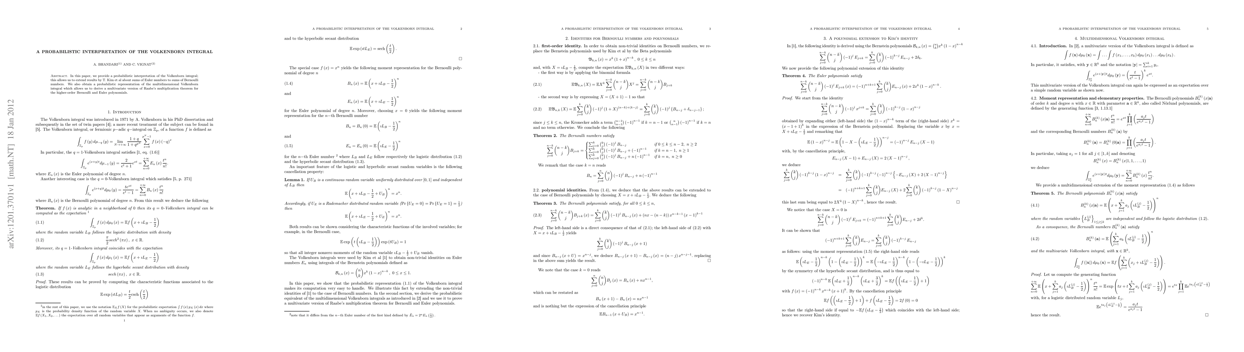 In this paper, we provide a probabilistic interpretation of the Volkenborn integral; this allows us to extend results by T. Kim et al about sums of Euler numbers to sums of Bernoulli numbers. We also obtain a probabilistic representation of the multidimensional Volkenborn integral which allows us to derive a multivariate version of Raabe's multiplication theorem for the higher-order Bernoulli and Euler polynomials.