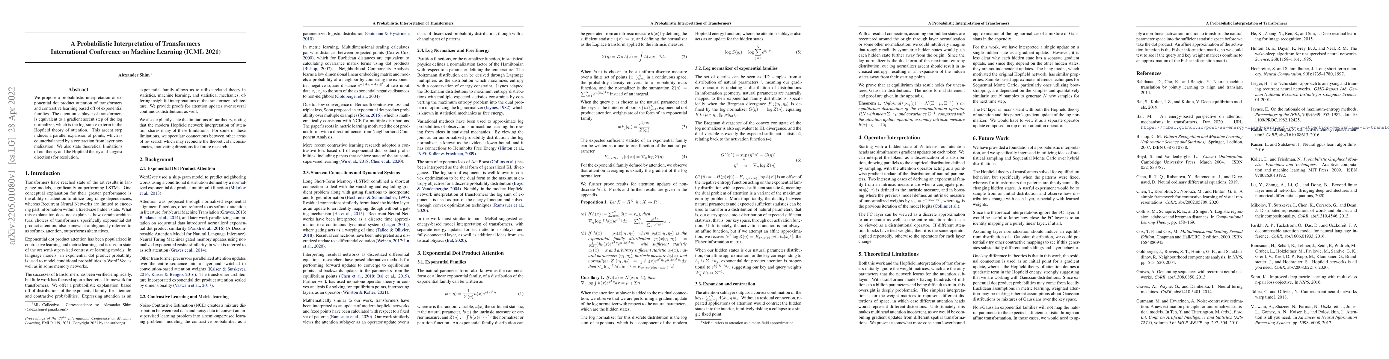 We propose a probabilistic interpretation of exponential dot product attention of transformers and contrastive learning based off of exponential families. The attention sublayer of transformers is equivalent to a gradient ascent step of the log normalizer, which is the log-sum-exp term in the Hopfield theory of attention. This ascent step induces a parallel expansion of points, which is counterbalanced by a contraction from layer normalization. We also state theoretical limitations of our theory and the Hopfield theory and suggest directions for resolution.