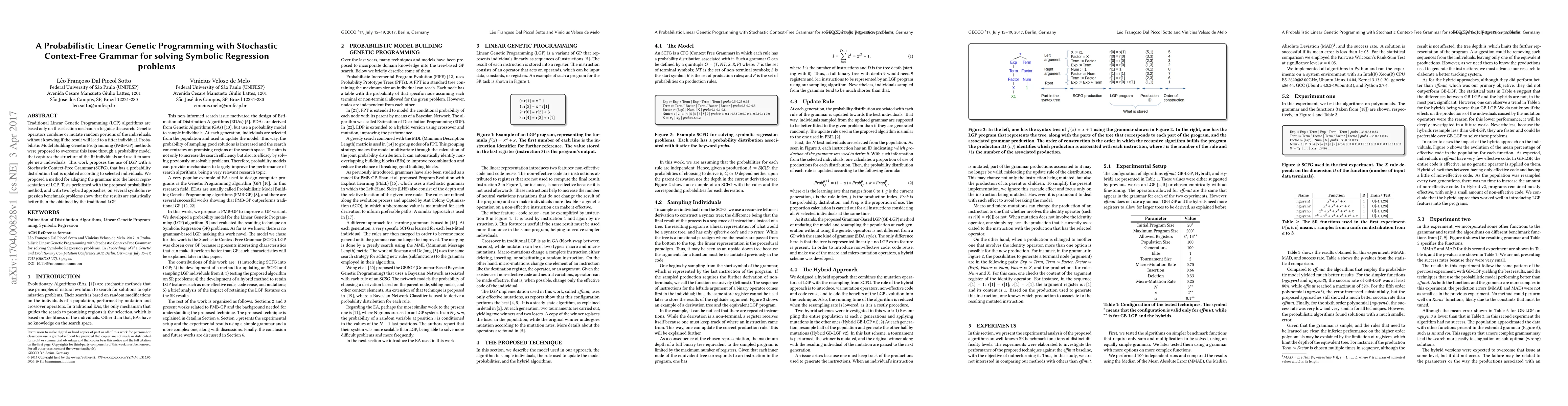 This paper introduces a Probabilistic Linear Genetic Programming (LGP) using Stochastic Context-Free Grammar (SCFG) to enhance symbolic regression. The proposed method updates the probability distribution of the grammar based on selected individuals, leading to statistically better results compared to traditional LGP on benchmark problems.