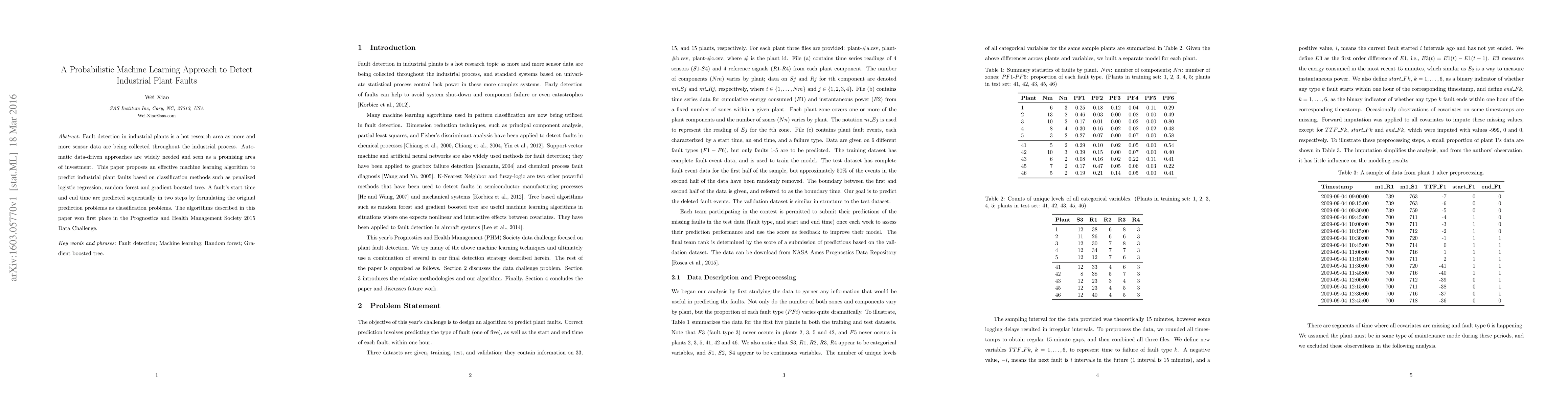 This paper proposes a probabilistic machine learning approach using penalized logistic regression, random forest, and gradient boosted trees to detect industrial plant faults. The method sequentially predicts fault start and end times, winning first place in the 2015 Prognostics and Health Management Society Data Challenge.