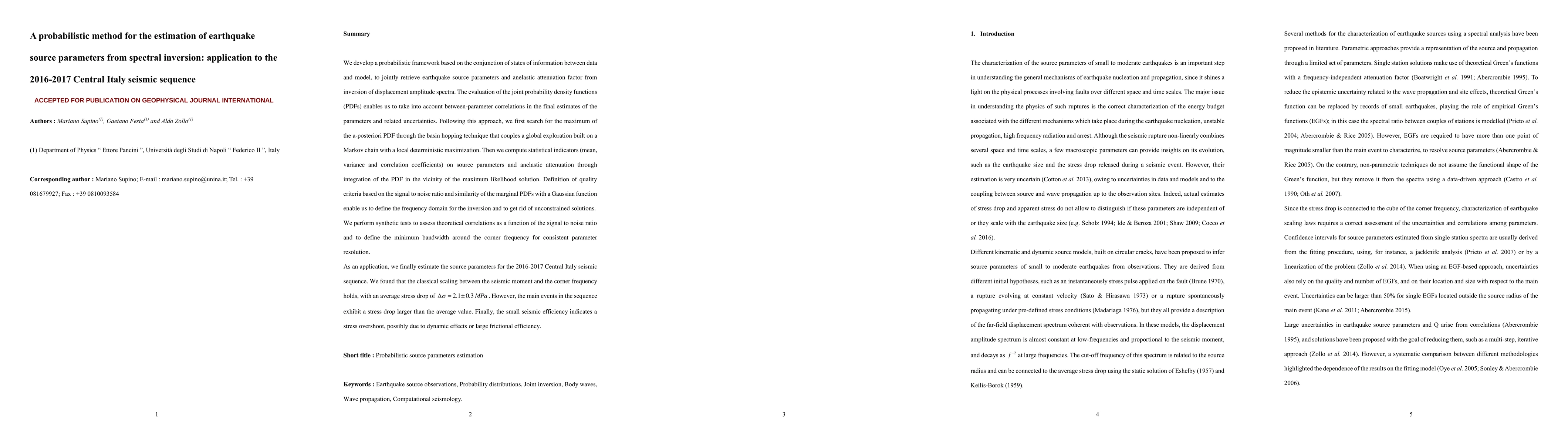 This paper introduces a probabilistic method for estimating earthquake source parameters and attenuation factors using spectral inversion, emphasizing the consideration of parameter correlations. The method is applied to the 2016-2017 Central Italy seismic sequence, revealing an average stress drop of 2.1 ± 0.3 MPa, with main events showing higher stress drops and suggesting dynamic effects or large frictional efficiency.