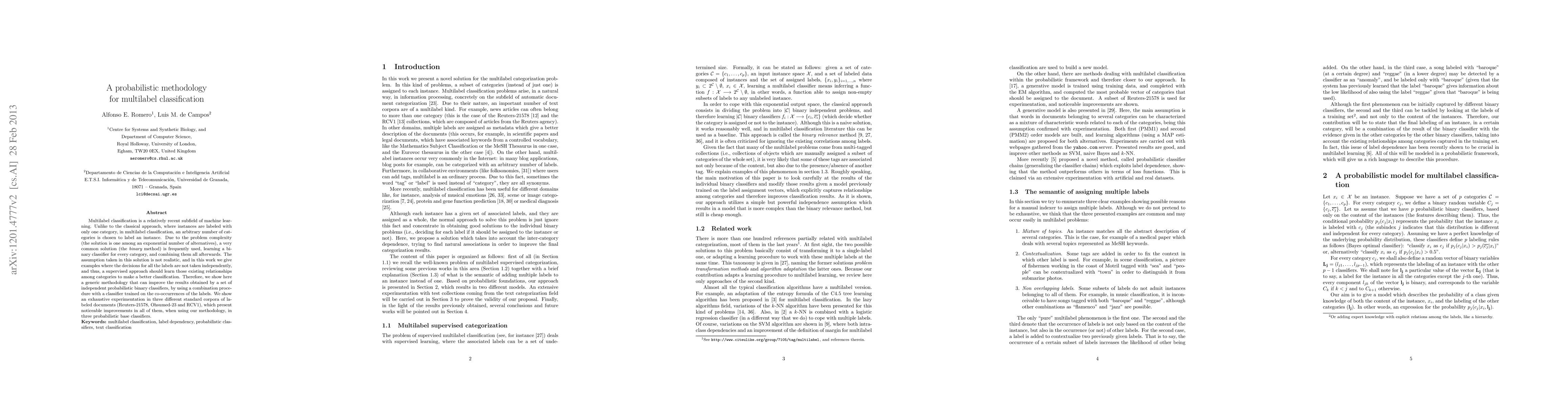Multilabel classification is a relatively recent subfield of machine learning. Unlike to the classical approach, where instances are labeled with only one category, in multilabel classification, an arbitrary number of categories is chosen to label an instance. Due to the problem complexity (the solution is one among an exponential number of alternatives), a very common solution (the binary method) is frequently used, learning a binary classifier for every category, and combining them all afterwards. The assumption taken in this solution is not realistic, and in this work we give examples where the decisions for all the labels are not taken independently, and thus, a supervised approach should learn those existing relationships among categories to make a better classification. Therefore, we show here a generic methodology that can improve the results obtained by a set of independent probabilistic binary classifiers, by using a combination procedure with a classifier trained on the co-occurrences of the labels. We show an exhaustive experimentation in three different standard corpora of labeled documents (Reuters-21578, Ohsumed-23 and RCV1), which present noticeable improvements in all of them, when using our methodology, in three probabilistic base classifiers.