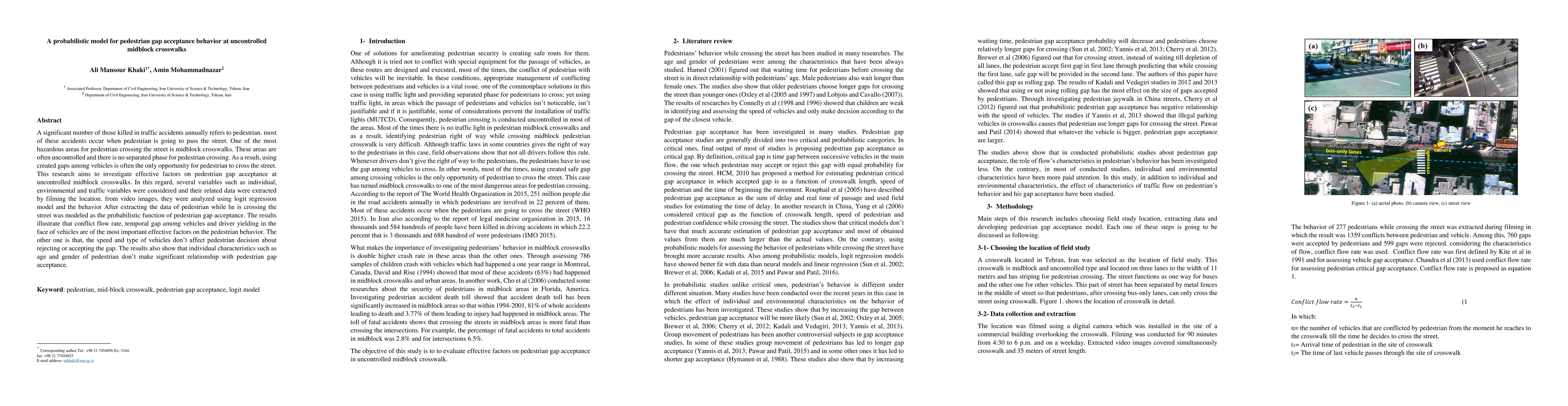 A significant number of those killed in traffic accidents annually refers to pedestrians. most of these accidents occur when a pedestrian is going to pass the street. One of the most hazardous areas for pedestrians crossing the street is midblock crosswalks. These areas are often uncontrolled and there is no separated phase for pedestrian crossing. As a result, using created gaps among vehicles is often the only opportunity for pedestrians to cross the street. This research aims to investigate effective factors on pedestrian gap acceptance at uncontrolled mid-block crosswalks. In this regard, several variables such as individual, environmental, and traffic variables were considered and their related data were extracted by filming the location. from video images, they were analyzed using logit regression model and the behavior After extracting the data of pedestrian while he is crossing the street was modeled as the probabilistic function of pedestrian gap acceptance. The results illustrate that conflict flow rate, the temporal gap among vehicles, and driver yielding in the face of vehicles are the most important effective factors on pedestrian behavior. The other one is that the speed and type of vehicles do not affect the pedestrian's decision about rejecting or accepting the gap. The results also show that individual characteristics such as age and gender of pedestrians do not make a significant relationship with pedestrian gap acceptance.
