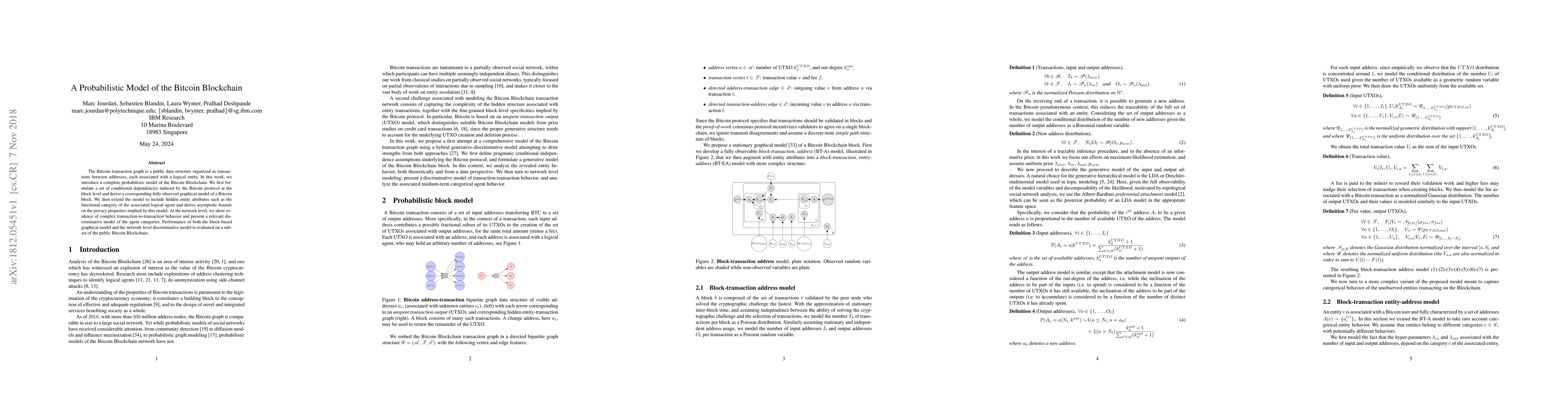 This paper introduces a probabilistic model of the Bitcoin blockchain, detailing conditional dependencies at the block level and extending it to include hidden entity attributes. It evaluates the model's privacy properties and presents a discriminative model for agent categories, demonstrating complex transaction behaviors.