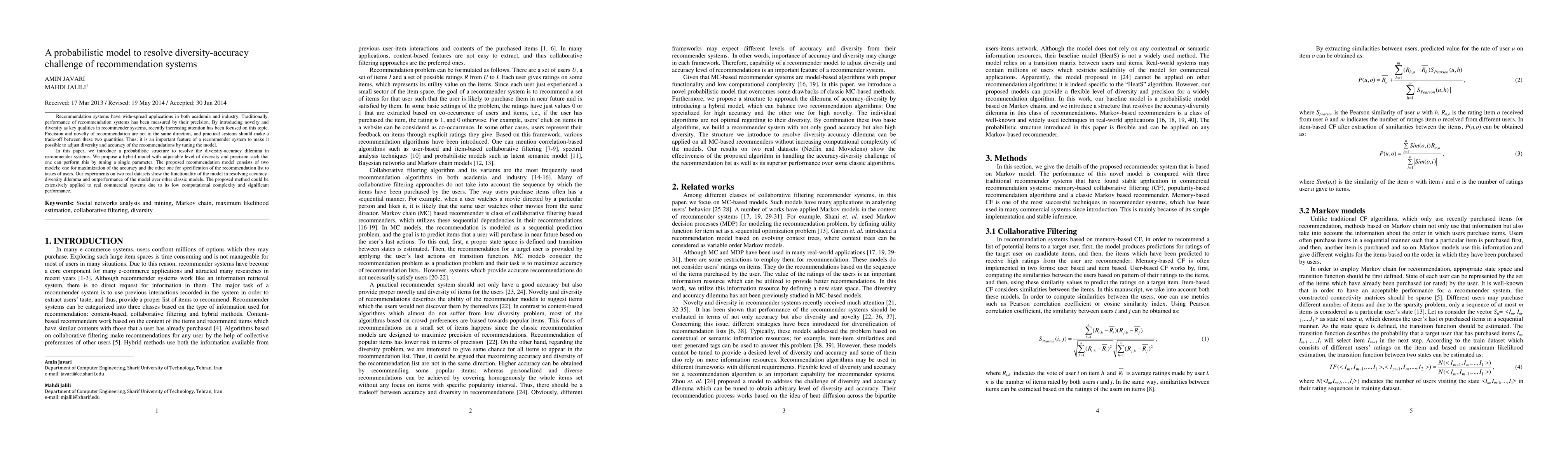This paper introduces a probabilistic model to balance the diversity-accuracy trade-off in recommendation systems, proposing a hybrid model that adjusts both diversity and precision via a single tunable parameter. Experiments demonstrate its effectiveness over traditional models in real datasets.