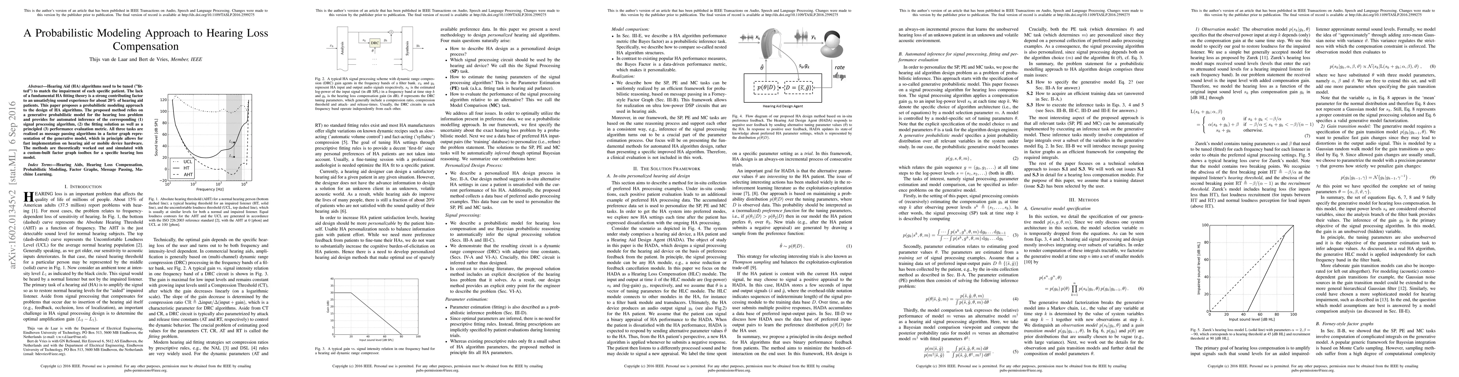 The paper introduces a probabilistic modeling approach for hearing loss compensation, providing a unified framework for automated inference of signal processing algorithms, fitting solutions, and performance evaluation metrics using message passing in factor graphs.