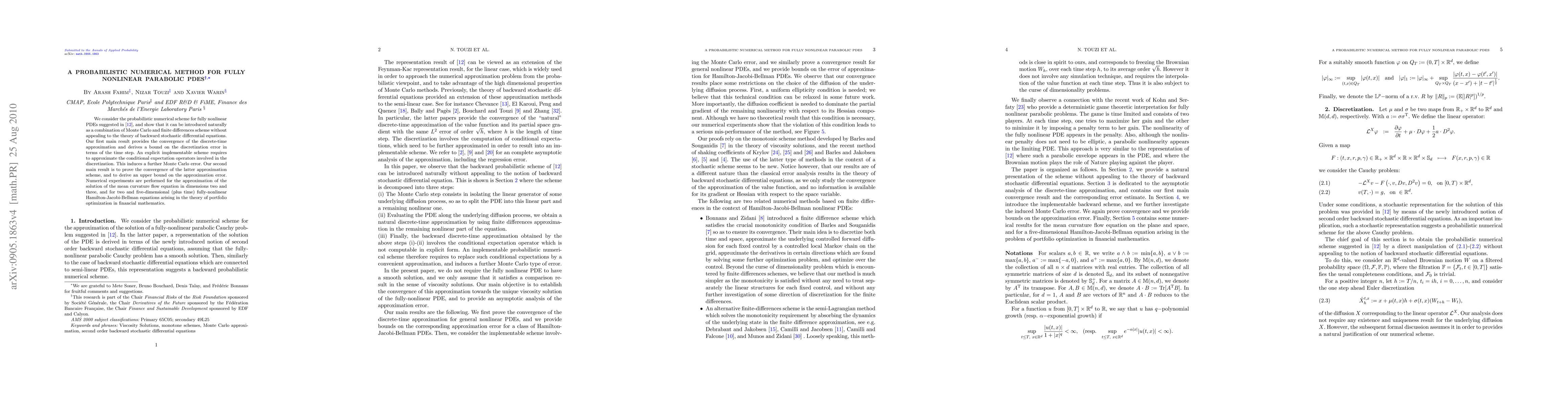 This paper introduces a probabilistic numerical method combining Monte Carlo and finite differences for solving fully nonlinear parabolic PDEs, proving its convergence and deriving bounds for discretization and Monte Carlo errors. Numerical experiments validate the method for mean curvature flow and Hamilton-Jacobi-Bellman equations in portfolio optimization.