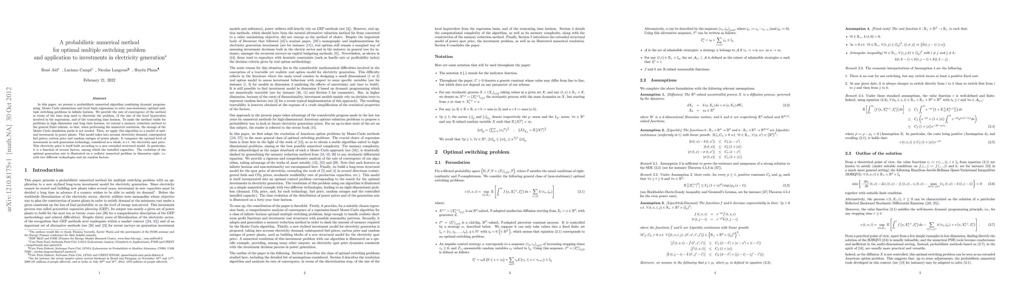 This paper introduces a probabilistic numerical method combining dynamic programming, Monte Carlo simulations, and local basis regressions to solve optimal multiple switching problems in infinite horizon. It applies this method to model optimal investment in electricity generation, considering factors like demand, fuel prices, and carbon prices, and demonstrates its effectiveness through a high-dimensional numerical example.