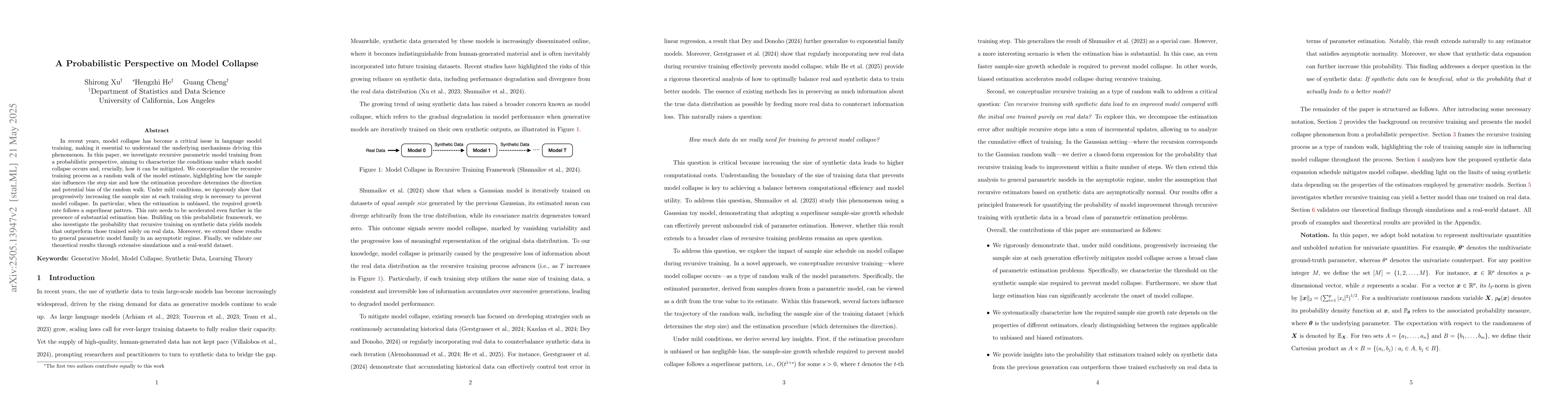 In recent years, model collapse has become a critical issue in language model training, making it essential to understand the underlying mechanisms driving this phenomenon. In this paper, we investigate recursive parametric model training from a probabilistic perspective, aiming to characterize the conditions under which model collapse occurs and, crucially, how it can be mitigated. We conceptualize the recursive training process as a random walk of the model estimate, highlighting how the sample size influences the step size and how the estimation procedure determines the direction and potential bias of the random walk. Under mild conditions, we rigorously show that progressively increasing the sample size at each training step is necessary to prevent model collapse. In particular, when the estimation is unbiased, the required growth rate follows a superlinear pattern. This rate needs to be accelerated even further in the presence of substantial estimation bias. Building on this probabilistic framework, we also investigate the probability that recursive training on synthetic data yields models that outperform those trained solely on real data. Moreover, we extend these results to general parametric model family in an asymptotic regime. Finally, we validate our theoretical results through extensive simulations and a real-world dataset.