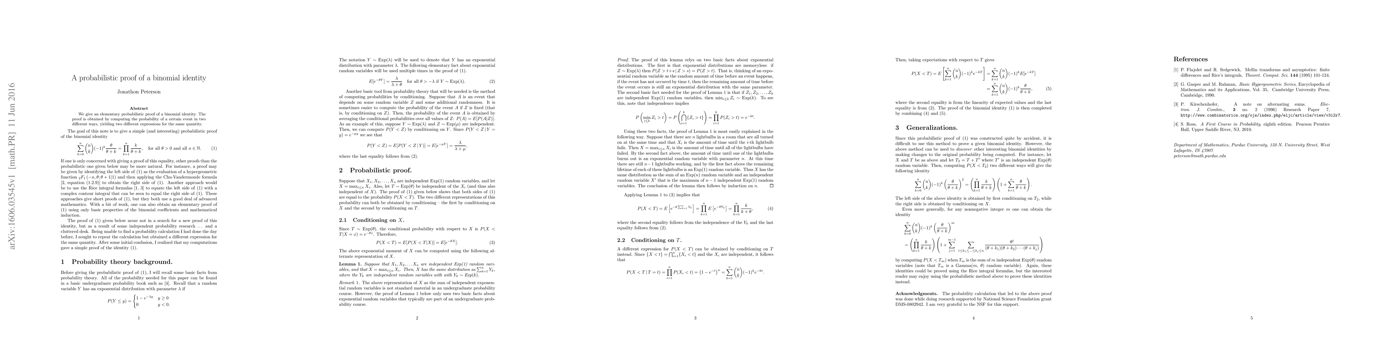 Summary: This paper presents an elementary probabilistic proof for a binomial identity by calculating the probability of a specific event in two distinct ways, leading to two expressions for the same quantity. The equivalence of these expressions establishes the identity.