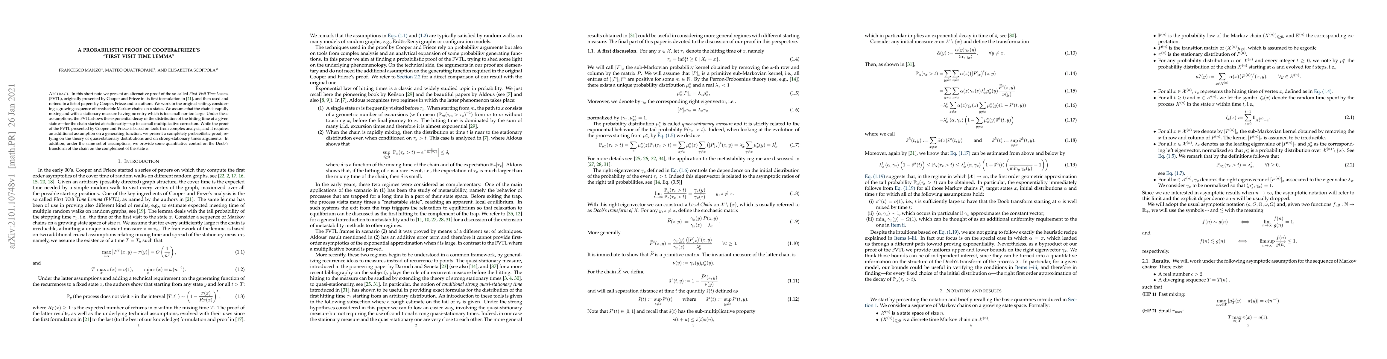 In this short note we present an alternative proof of the so-called First Visit Time Lemma (FVTL), originally presented by Cooper and Frieze in its first formulation in [21], and then used and refined in a list of papers by Cooper, Frieze and coauthors. We work in the original setting, considering a growing sequence of irreducible Markov chains on $n$ states. We assume that the chain is rapidly mixing and with a stationary measure having no entry which is too small nor too large. Under these assumptions, the FVTL shows the exponential decay of the distribution of the hitting time of a given state $x$ -- for the chain started at stationarity -- up to a small multiplicative correction. While the proof of the FVTL presented by Cooper and Frieze is based on tools from complex analysis, and it requires an additional assumption on a generating function, we present a completely probabilistic proof, relying on the theory of quasi-stationary distributions and on strong-stationary times arguments. In addition, under the same set of assumptions, we provide some quantitative control on the Doob's transform of the chain on the complement of the state $x$.