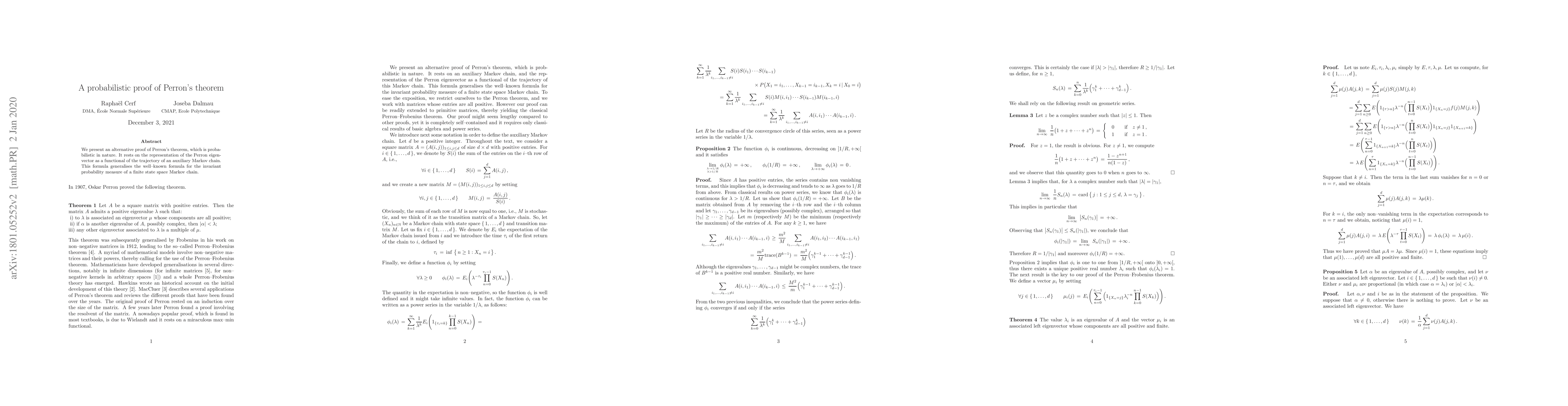 Summary: This paper offers a probabilistic proof of Perron's theorem, utilizing the representation of the Perron eigenvector as a functional of the trajectory of an auxiliary Markov chain. The approach leverages probabilistic methods to establish the theorem.