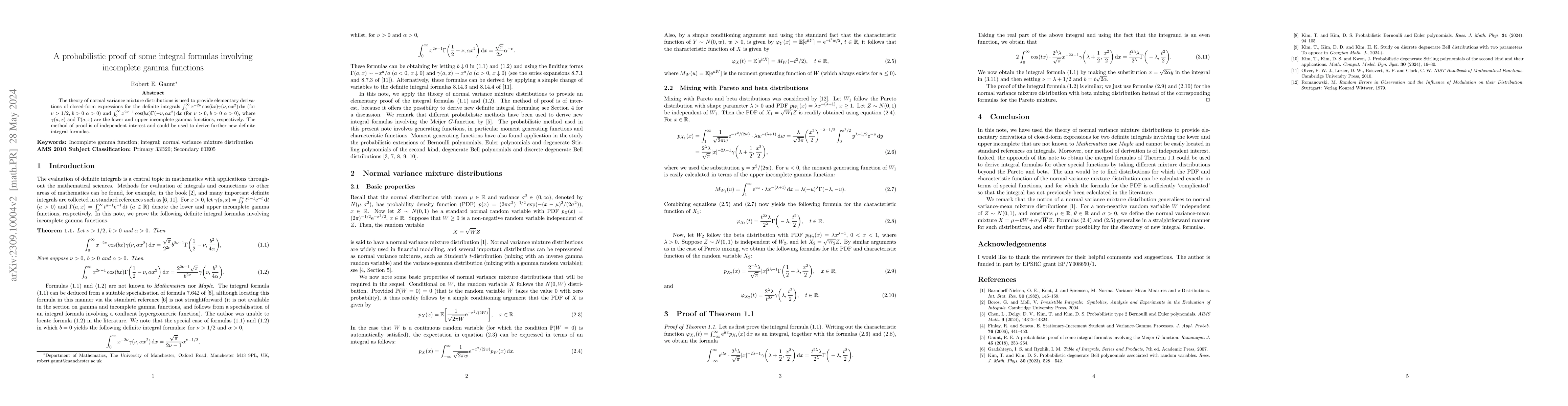 This paper uses normal variance mixture distributions to derive closed-form expressions for two definite integrals involving incomplete gamma functions, providing a probabilistic proof method that could be applied to derive additional integral formulas.