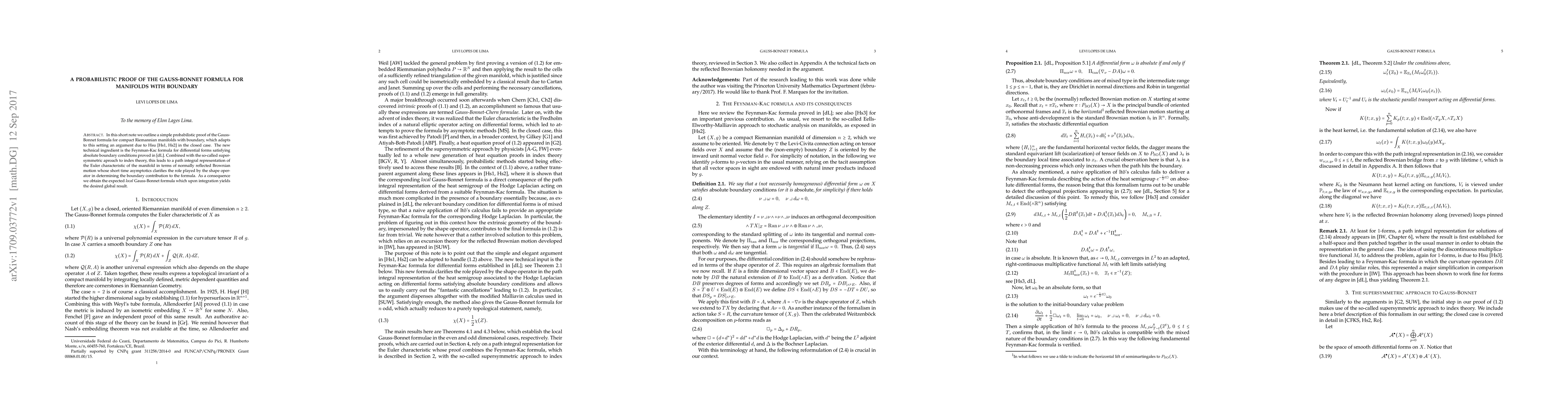 In this short note we outline a simple probabilistic proof of the Gauss-Bonnet formula for compact Riemannian manifolds with boundary, which adapts to this setting an argument due to Hsu \cite{Hs1,Hs2} in the closed case. The new technical ingredient is the Feynman-Kac formula for differential forms satisfying absolute boundary conditions proved in \cite{dL}. Combined with the so-called supersymmetric aproach to index theory, this leads to a path integral representation of the Euler characteristic of the manifold in terms of normally reflected Brownian motion whose short time asymptotics clarifies the role played by the shape operator in determining the boundary contribution to the formula. As a consequence we obtain the expected {\em local} Gauss-Bonnet formula which upon integration yields the desired global result.