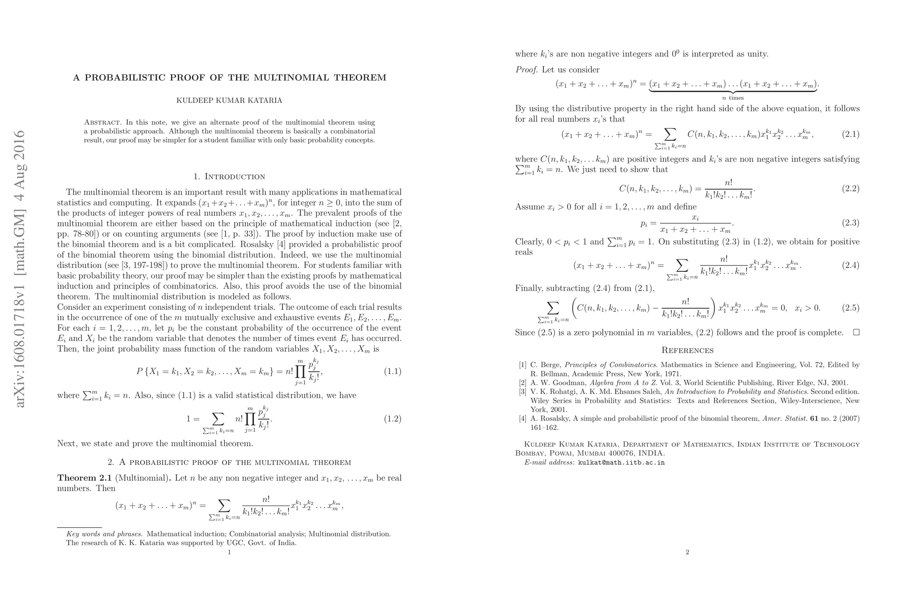 Summary: This paper presents a probabilistic proof of the multinomial theorem, offering a simpler approach for students with basic probability knowledge, contrasting with traditional combinatorial methods.