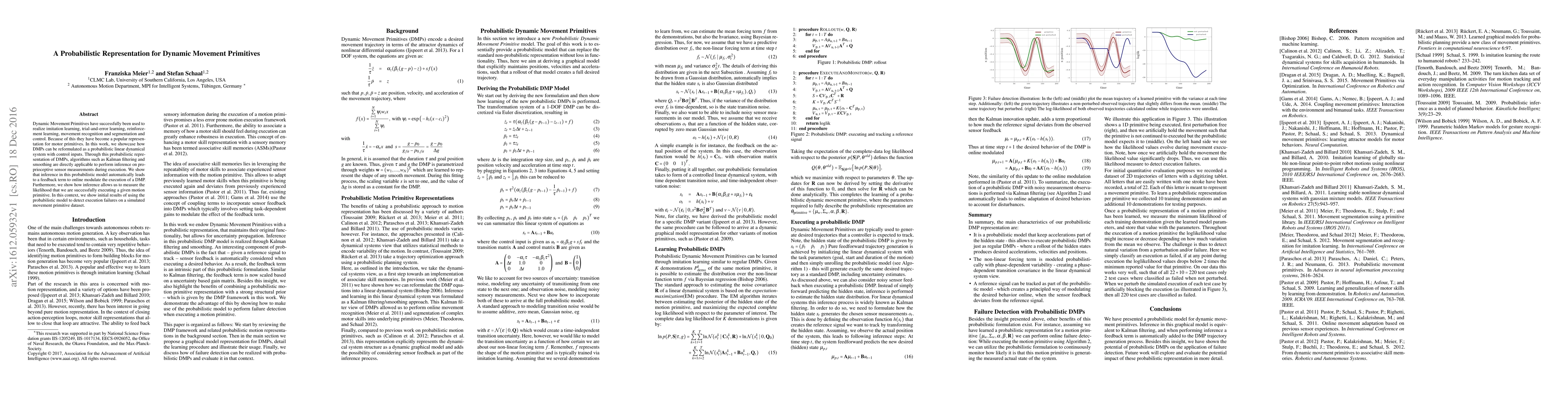 Dynamic Movement Primitives have successfully been used to realize imitation learning, trial-and-error learning, reinforce- ment learning, movement recognition and segmentation and control. Because of this they have become a popular represen- tation for motor primitives. In this work, we showcase how DMPs can be reformulated as a probabilistic linear dynamical system with control inputs. Through this probabilistic repre- sentation of DMPs, algorithms such as Kalman filtering and smoothing are directly applicable to perform inference on pro- prioceptive sensor measurements during execution. We show that inference in this probabilistic model automatically leads to a feedback term to online modulate the execution of a DMP. Furthermore, we show how inference allows us to measure the likelihood that we are successfully executing a given motion primitive. In this context, we show initial results of using the probabilistic model to detect execution failures on a simulated movement primitive dataset.