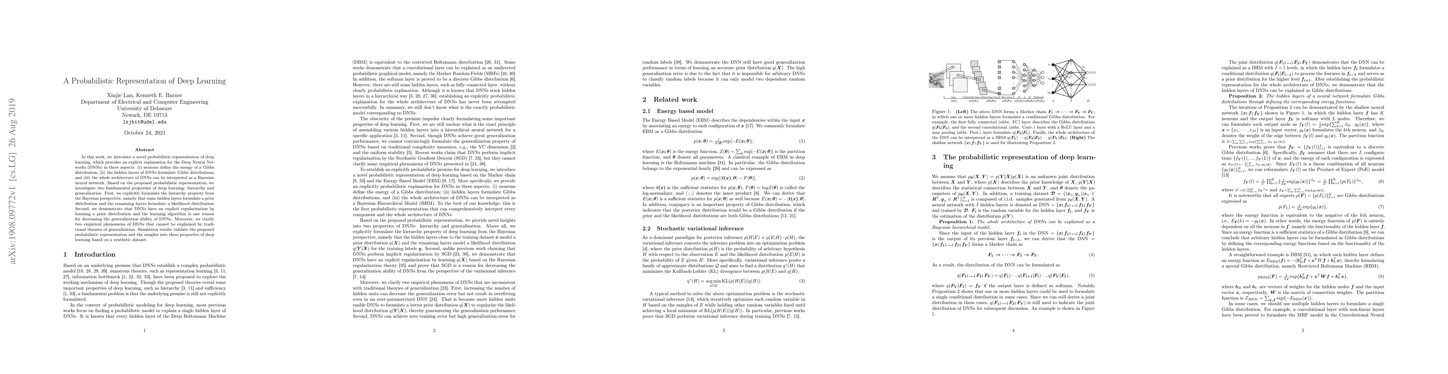 In this work, we introduce a novel probabilistic representation of deep learning, which provides an explicit explanation for the Deep Neural Networks (DNNs) in three aspects: (i) neurons define the energy of a Gibbs distribution; (ii) the hidden layers of DNNs formulate Gibbs distributions; and (iii) the whole architecture of DNNs can be interpreted as a Bayesian neural network. Based on the proposed probabilistic representation, we investigate two fundamental properties of deep learning: hierarchy and generalization. First, we explicitly formulate the hierarchy property from the Bayesian perspective, namely that some hidden layers formulate a prior distribution and the remaining layers formulate a likelihood distribution. Second, we demonstrate that DNNs have an explicit regularization by learning a prior distribution and the learning algorithm is one reason for decreasing the generalization ability of DNNs. Moreover, we clarify two empirical phenomena of DNNs that cannot be explained by traditional theories of generalization. Simulation results validate the proposed probabilistic representation and the insights into these properties of deep learning based on a synthetic dataset.