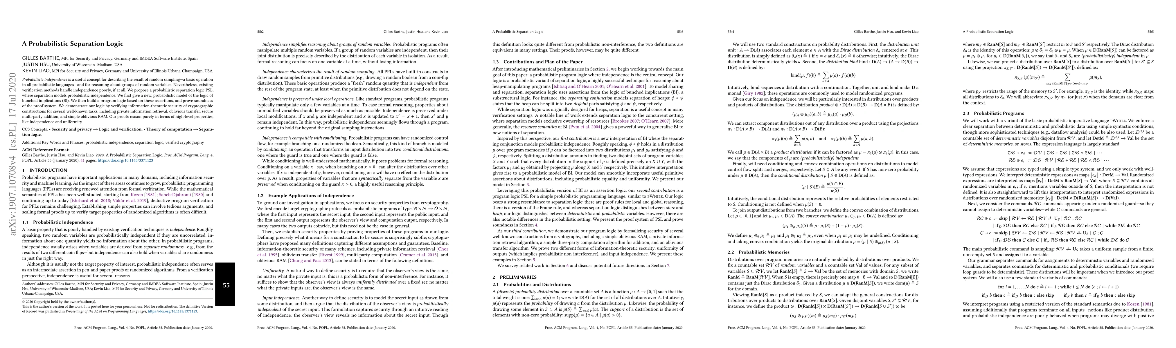 This paper proposes a probabilistic separation logic (PSL) to model probabilistic independence in verification methods. It introduces a new probabilistic model of bunched implications and demonstrates the logic's effectiveness in verifying the information-theoretic security of cryptographic constructions.