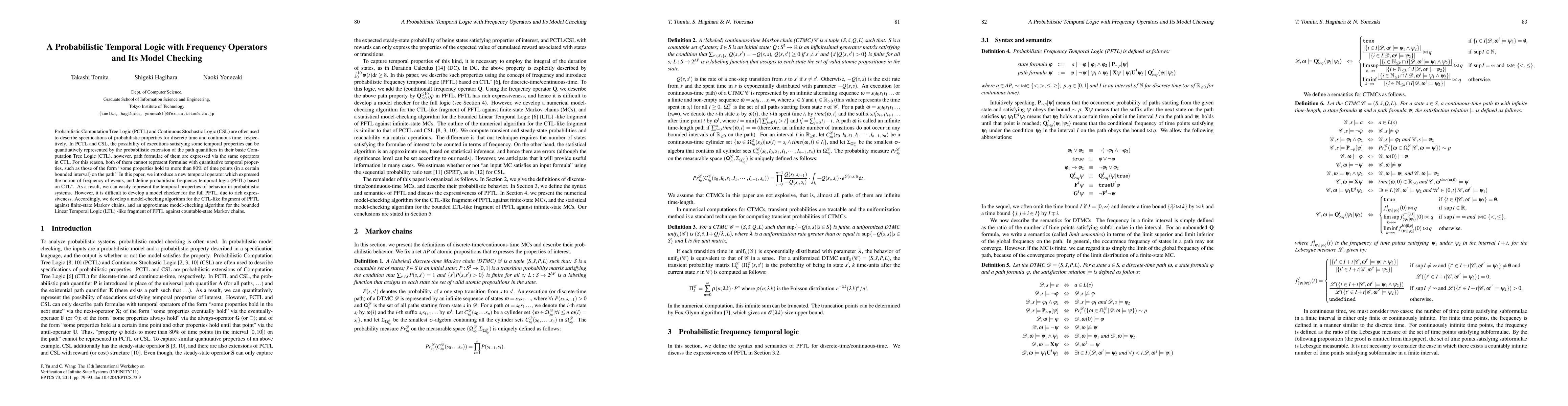 This paper introduces Probabilistic Frequency Temporal Logic (PFTL), which extends CTL* with a new frequency operator to represent temporal properties quantitatively, such as "properties hold at more than 80% of time points." It develops a model-checking algorithm for a CTL-like fragment against finite-state Markov chains and an approximate model-checking algorithm for a bounded LTL-like fragment against countable-state Markov chains.