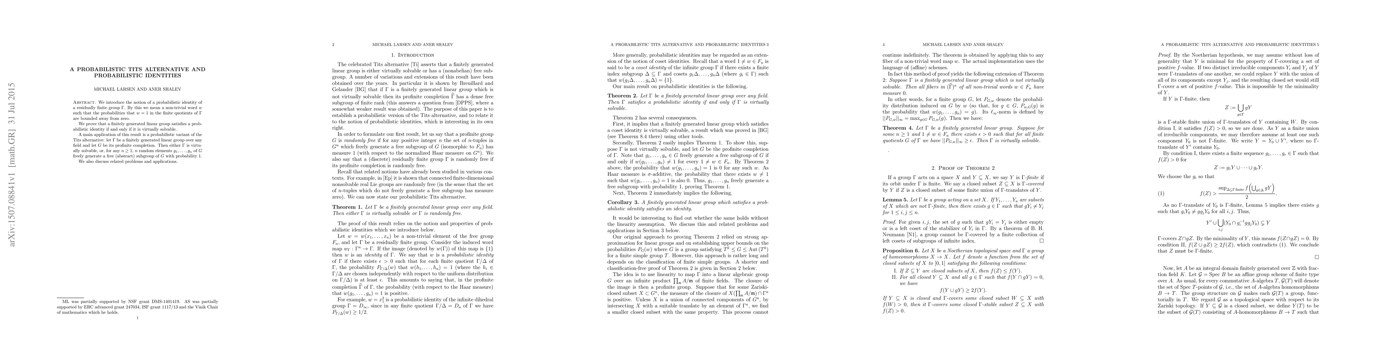 We introduce the notion of a probabilistic identity of a residually finite group. We prove that a finitely generated linear group satisfies a probabilistic identity if and only if it is virtually solvable. As an application, we prove a probabilistic variant of the Tits alternative: let G be the profinite completion of a finitely generated linear group. Then either G is virtually solvable, or for any positive integer n, with probability one, n independent, uniformly distributed elements of G freely generate a free subgroup of G of rank n.