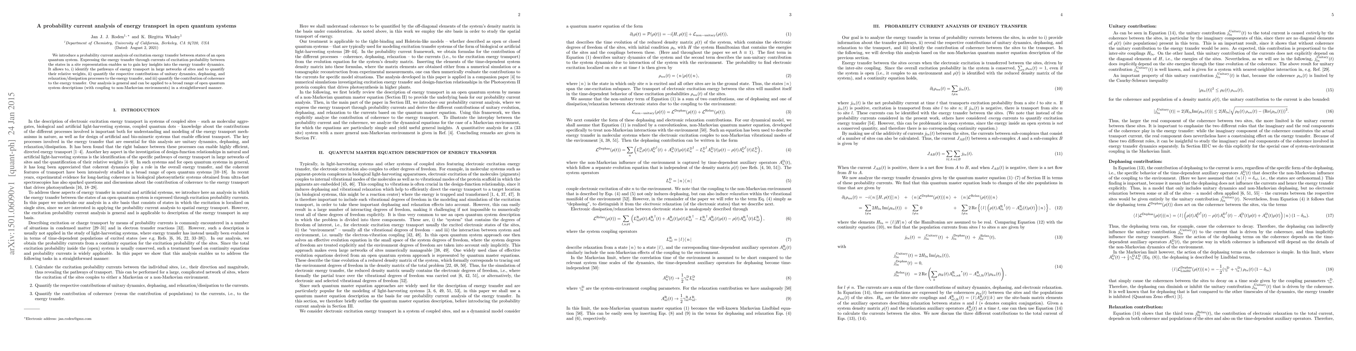 We introduce a probability current analysis of excitation energy transfer between states of an open quantum system. Expressing the energy transfer through currents of excitation probability between the states in a site representation enables us to gain key insights into the energy transfer dynamics. It allows to, i) identify the pathways of energy transport in large networks of sites and to quantify their relative weights, ii) quantify the respective contributions of unitary dynamics, dephasing, and relaxation/dissipation processes to the energy transfer, and iii) quantify the contribution of coherence to the energy transfer. Our analysis is general and can be applied to a broad range of open quantum system descriptions (with coupling to non-Markovian environments) in a straightforward manner.