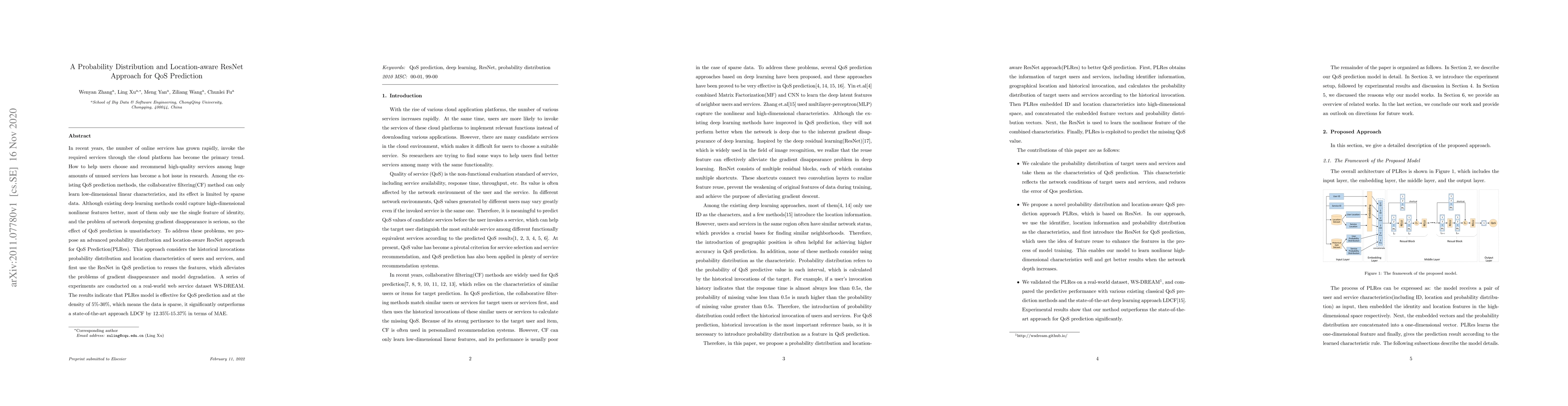 In recent years, the number of online services has grown rapidly, invoke the required services through the cloud platform has become the primary trend. How to help users choose and recommend high-quality services among huge amounts of unused services has become a hot issue in research. Among the existing QoS prediction methods, the collaborative filtering(CF) method can only learn low-dimensional linear characteristics, and its effect is limited by sparse data. Although existing deep learning methods could capture high-dimensional nonlinear features better, most of them only use the single feature of identity, and the problem of network deepening gradient disappearance is serious, so the effect of QoS prediction is unsatisfactory. To address these problems, we propose an advanced probability distribution and location-aware ResNet approach for QoS Prediction(PLRes). This approach considers the historical invocations probability distribution and location characteristics of users and services, and first use the ResNet in QoS prediction to reuses the features, which alleviates the problems of gradient disappearance and model degradation. A series of experiments are conducted on a real-world web service dataset WS-DREAM. The results indicate that PLRes model is effective for QoS prediction and at the density of 5%-30%, which means the data is sparse, it significantly outperforms a state-of-the-art approach LDCF by 12.35%-15.37% in terms of MAE.