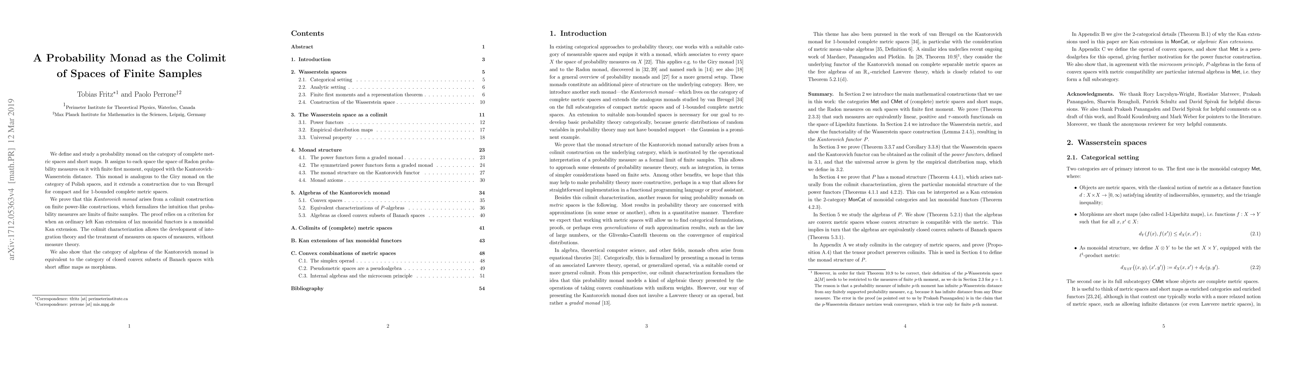 This paper defines a probability monad on complete metric spaces, linking it to spaces of Radon probability measures with finite first moments and the Kantorovich-Wasserstein distance. It demonstrates that this monad arises from a colimit of finite samples, thus formalizing the idea that probability measures are limits of finite samples.