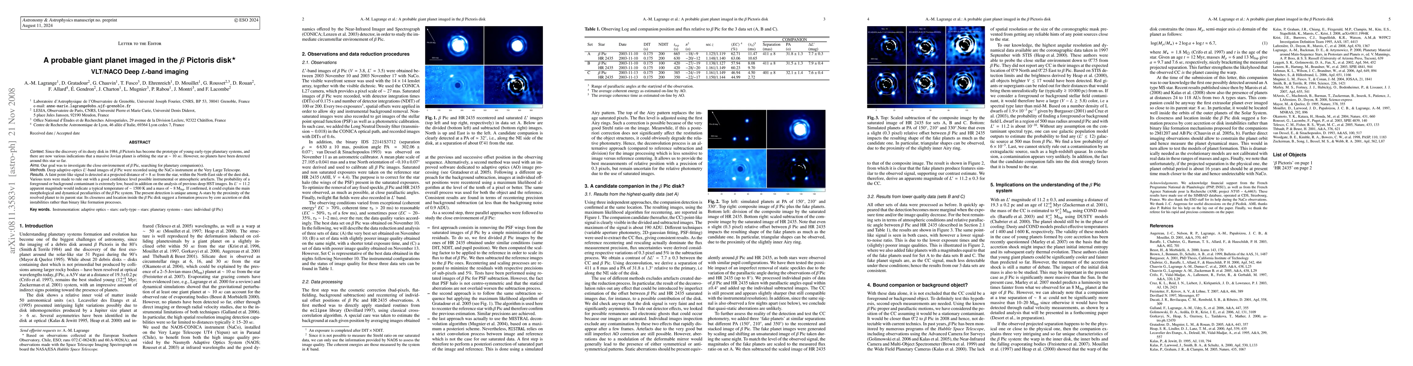 This paper reports the detection of a faint point-like signal in deep adaptive-optics L'-band images of Beta Pictoris, suggesting a giant planet with a mass of ~8 Jovian masses orbiting at ~8 AU from the star. The detection is likely not an artifact, and if confirmed, it could explain the system's peculiar dynamics.