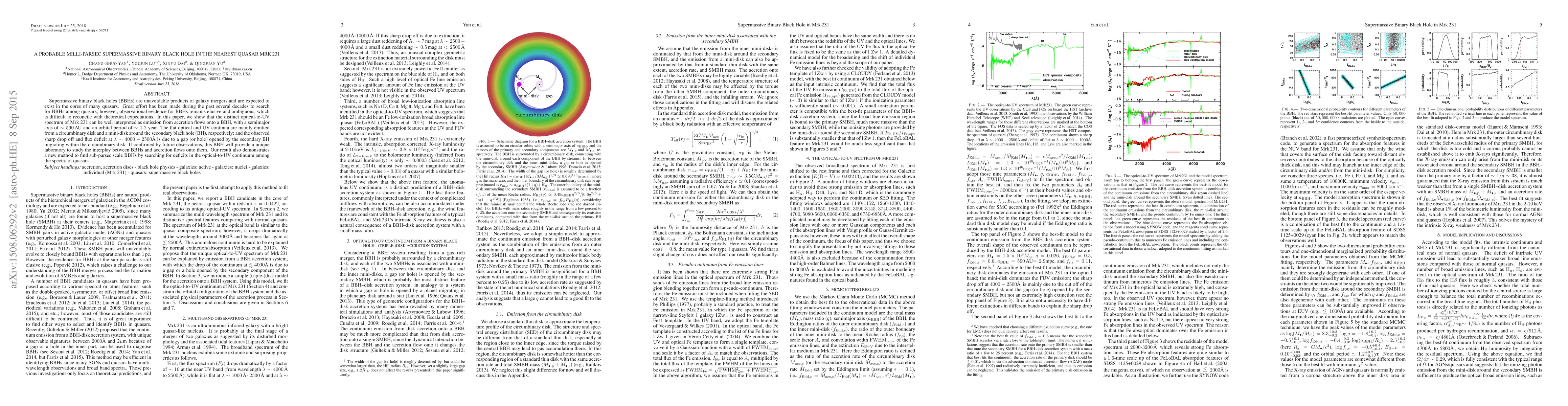 This paper presents evidence for a probable supermassive binary black hole in the quasar Mrk 231, characterized by a semimajor axis of ~590 AU and an orbital period of ~1.2 years. The distinct optical-to-UV spectrum suggests emission from accretion flows onto the binary, with a unique flux deficit due to the secondary black hole's interaction with the circumbinary disk.