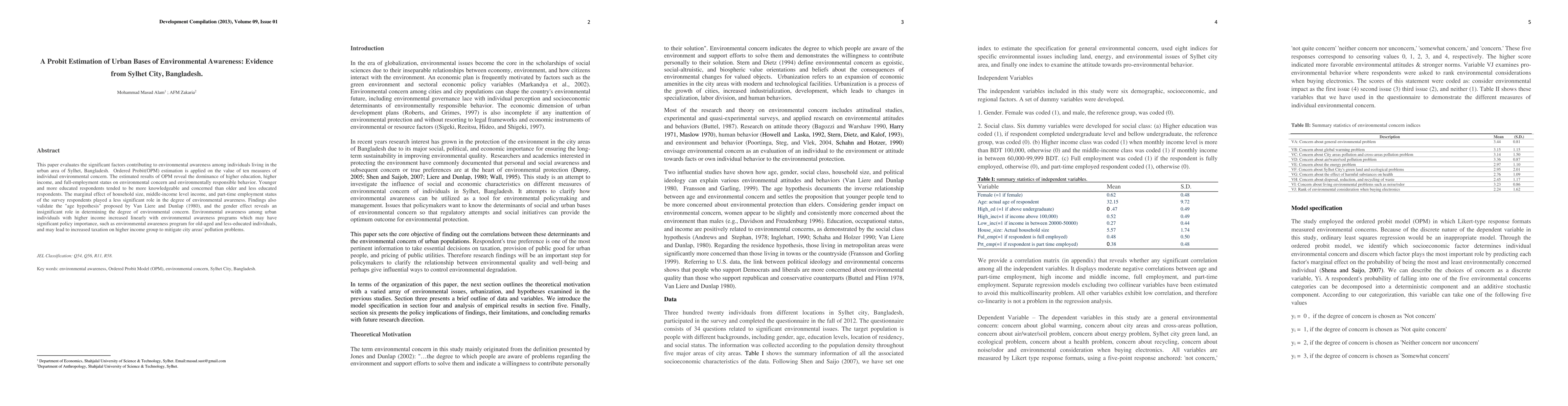 This paper evaluates the significant factors contributing to environmental awareness among individuals living in the urban area of Sylhet, Bangladesh. Ordered Probit(OPM) estimation is applied on the value of ten measures of individual environmental concern. The estimated results of OPM reveal the dominance of higher education, higher income, and full-employment status on environmental concern and environmentally responsible behavior. Younger and more educated respondents tended to be more knowledgeable and concerned than older and less educated respondents. The marginal effect of household size, middle-income level income, and part-time employment status of the survey respondents played a less significant role in the degree of environmental awareness. Findings also validate the "age hypothesis" proposed by Van Liere and Dunlap (1980), and the gender effect reveals an insignificant role in determining the degree of environmental concern. Environmental awareness among urban individuals with higher income increased linearly with environmental awareness programs which may have significant policy importance, such as environmental awareness programs for old-aged and less-educated individuals, and may lead to increased taxation on higher income groups to mitigate city areas' pollution problems.